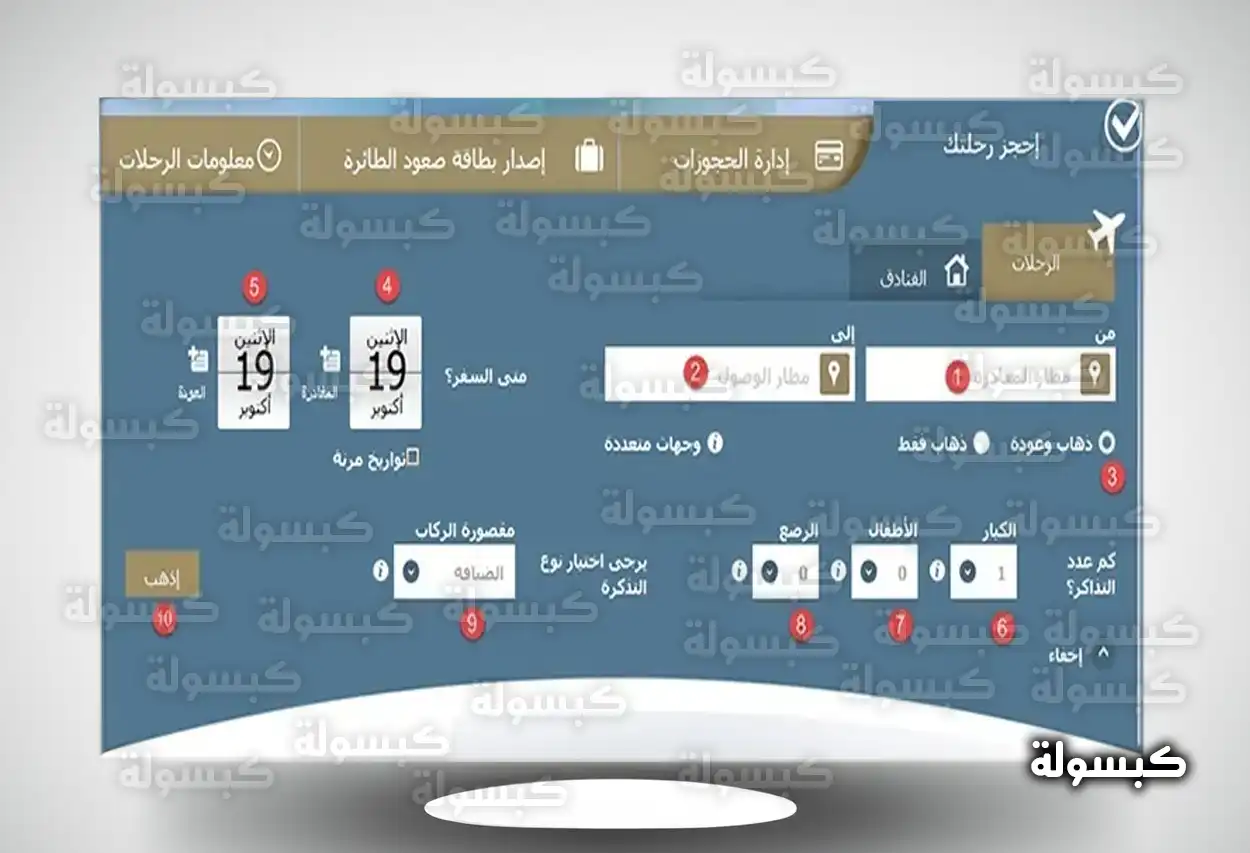 - حدد موعد السفر اللي في بالك ولا تنسى تسجل تاريخ المغادرة وتاريخ العودة إذا كانت رحلتك ذهاب وعودة.
