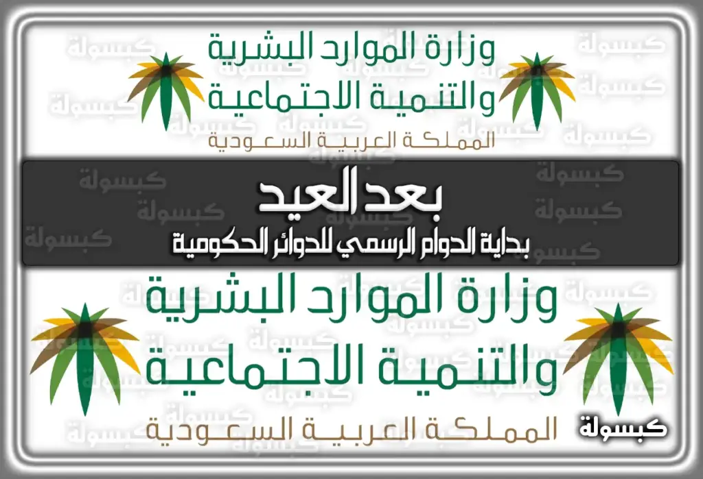 - وبذلك فإن هناك بعض المواعيد التي يعلن عنها لتكون بداية العمل في المؤسسات مرة أخرى من بعد العطلة التي حصلوا عليها في العيد والتي تحددها المؤسسة المتمثلة في وزارة الموارد البشرية والتنمية الاجتماعية السعودية.