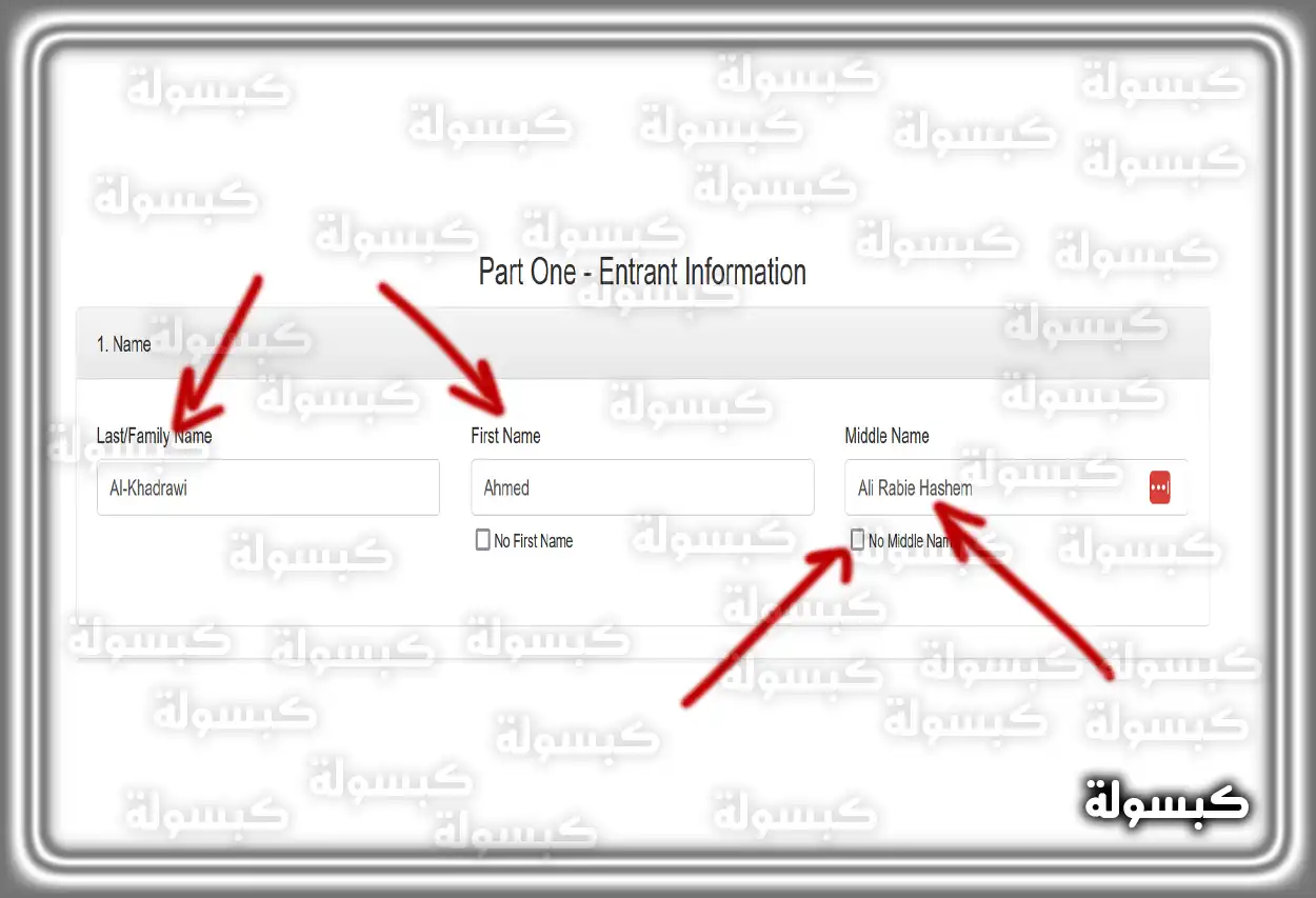 بعد ما اتبعنا الخطوات الأولى ندخل على الخانة Middle Name هنا ببساطة انت هتكتب كل الأسماء اللي بين اسمك الأول والأخير يعني لو احنا مأخذين المثال اللي فات: Ahmed Ali Rabie Hashem Al-Khadrawi الأسماء اللي بين Ahmed و Al-Khadrawi هي: Ali Rabie Hashem وطبعا لو تبى انك لا تكتب الأسماء الوسطى ببساطة علم على خيار No Middle Name وكده يبقى تمام ومش هيكون فيه أي مشكلة إن شاء الله.