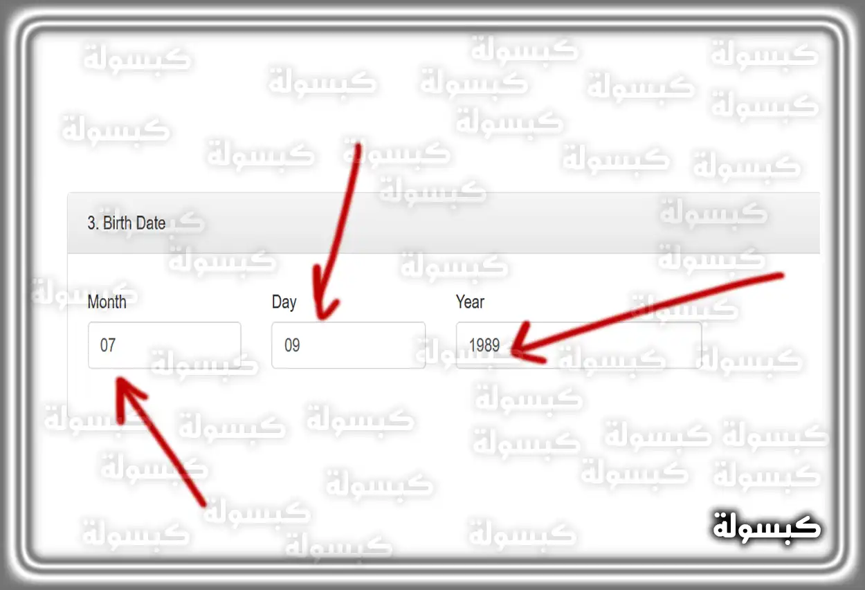 نمشي للخانة اللي بعدها وده تاريخ الميلاد / Birth Date وهنا الأمور تحتاجك تكون مركز شوية، الشهر واليوم لازم يكونوا برقمين فلو انت مولود في 9 يوليو 1989 هتكتب في خانة الشهر 07 وفي خانة اليوم 09 والسنة 1989.