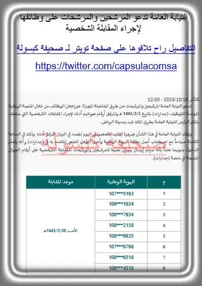 إذ توجهت النيابة العامة برسالة هامة للمرشحين والمرشحات وأكدت على أهمية الحضور في اليوم والوقت المحددين المذكورين في البيان أدناه وهو الساعة 8 صباحًا ولما تجون لا تنسوا تجيبوا معكم أصل بطاقة الهوية وأصل المؤهل اللي قدمتوا فيه على منصة جدارات لأن ما راح يكون فيه دخول بدونهم وعشان تكونوا على بينة راح توصلكم رسائل نصية على الجوالات اللي سجلتوها في جدارات توضح تفاصيل المقابلة الشخصية.