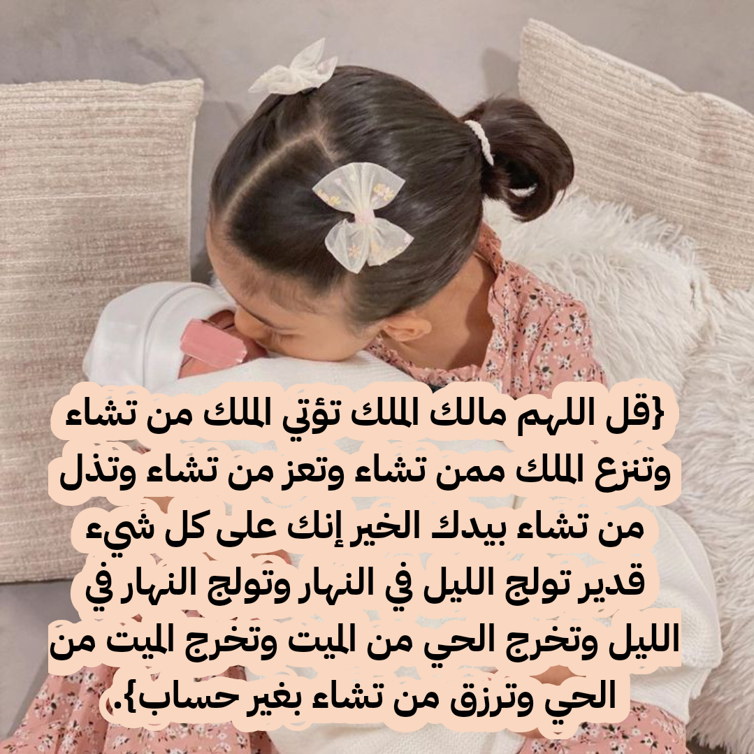 - اللهمَّ أنتَ ربي لا إلهَ إلّا أنتَ عليكَ توكلتُ وأنتَ ربُّ العرشِ العظيمِ ما شاء اللهُ كان وما لم يشأْ لم يكنْ ولا حولَ ولا قوةَ إلّا باللهِ أعلمُ أنَّ اللهَ على كلِّ شيءٍ قديرٌ وأنَّ اللهَ قد أحاط بكلِّ شيءٍ علمًا وأحصى كلَّ شيءٍ عددًا.