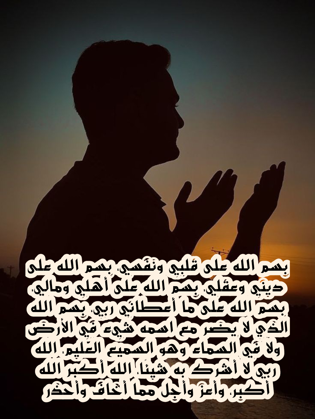 - بِسمِ الله علَى قَلبي ونَفسي، بِسمِ الله علَى ديني وعَقلِي، بِسمِ الله علَى أهلِي ومَالِي بِسمِ الله علَى كُلِّ شيءٍ رزَقنِي بِه رَبِّي بِسمِ الله الَّذِي بِاسْمِه ما يَضرُّ شيءٌ فِي الأرضِ وَلا فِي السَّماءِ وهُو السَّمِيعُ العَلِيمُ اللهُ هُوَ رَبِّي وَلا أُشْرِك بِه أحدًا اللهُ أكْبَرُ وَأعزُّ وأجلُّ مِن كُلِّ مَخاوِفَ وَأهْوالٍ عَزَّ جَارُك وَجَلَّ ثَناؤُك وَلا إله غيرُك اللَّهُمَّ إنِّي وَكّلتُ أمرِي إِلَيْكَ فاحفَظنِي أنَا وَكُلَّ مَن أُحبُّهم.