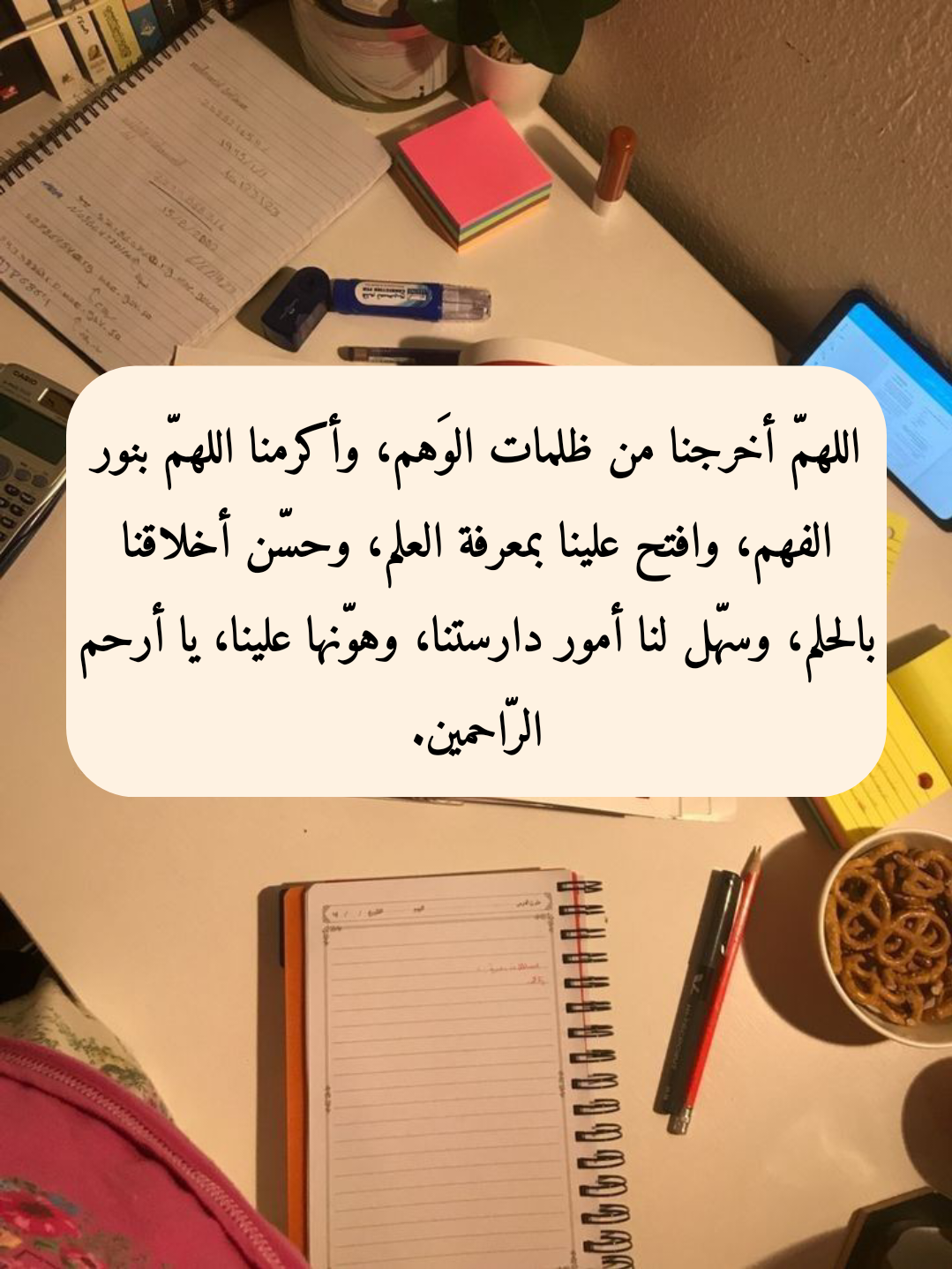 - اللهم إني أستعين بك وأتوكل عليك فأعنِّي على دراستي ويسِّر لي كل أمر عسير ووفقني لما فيه الخير والصلاح وأبعد عني كل شر، رب اشرح لي صدري.