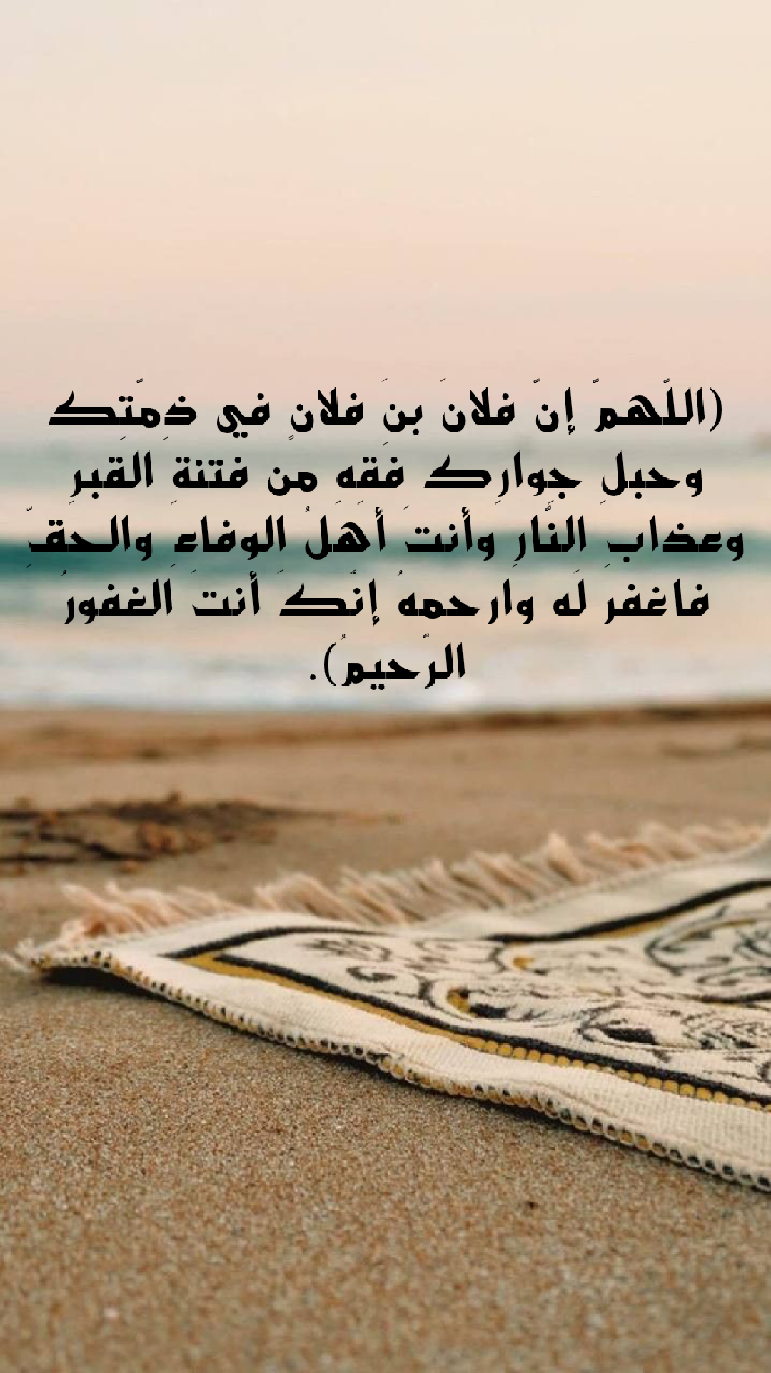 - اللهم اجعل من سبقني إلى رحمتك مقيمًا في جنتك راضيًا مطمئنًا، اللهم تجاوز عن زلاته وارحمه برحمتك الواسعة، اللهم اسكب الطمأنينة على قلوبنا الحزينة وامنحنا القوة للتغلب على ألم الفرقا، اللهم اجعلنا ممن يرضون بقضائك وقدرك.