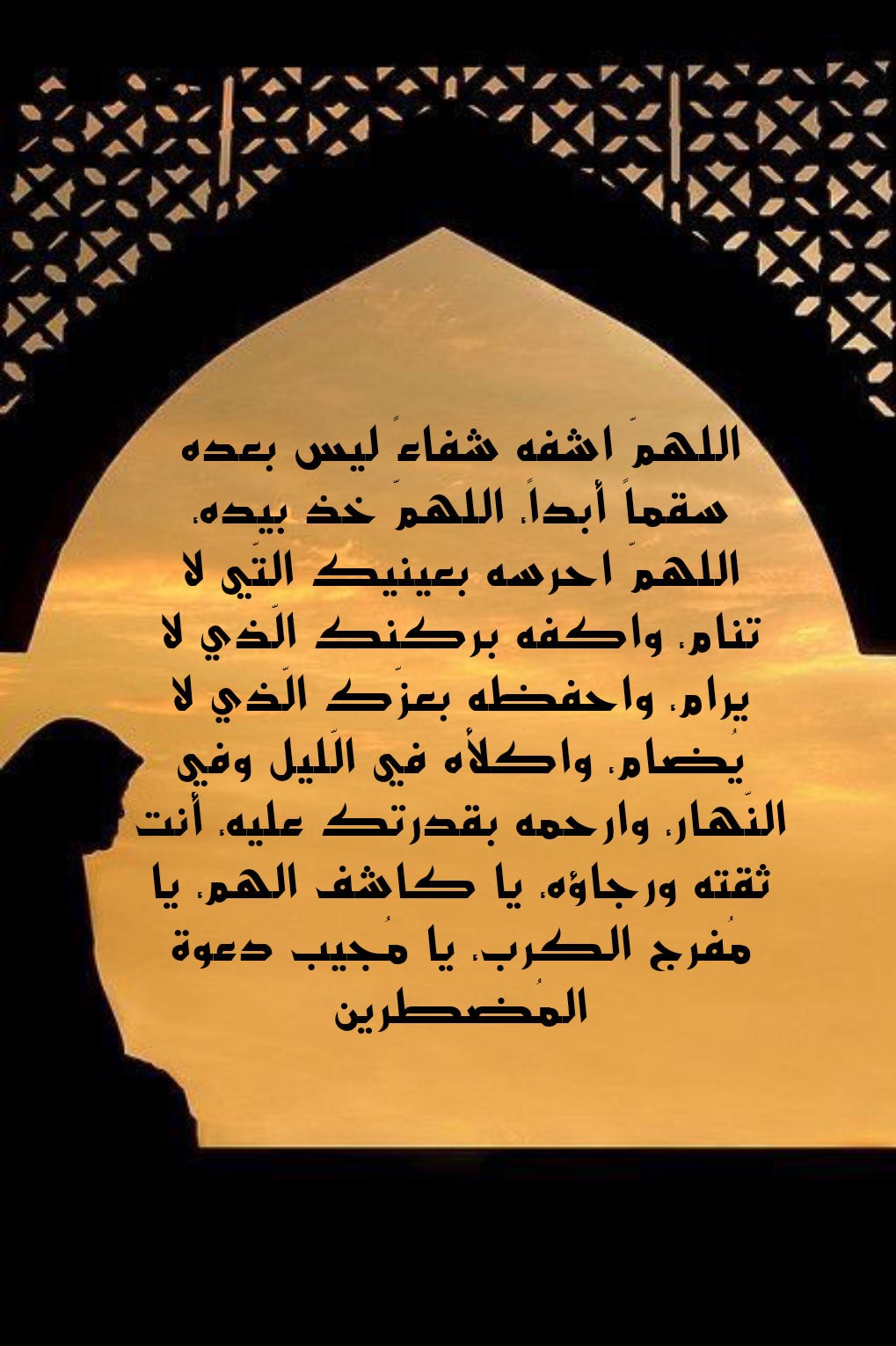 - اللهمّ لباس العافية والصحة هو أملنا فارزقه يا كريم عافيةً لا تُغادر جسده واشمله برحمتك الواسعة فهو عبدك الضعيف الذي لا حول له ولا قوة إلا بك.