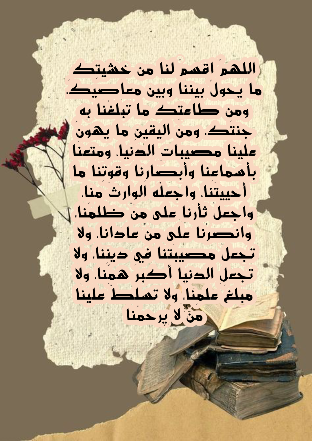 • اللهم يا مقلب القلوب ثبّت قلوبنا على طاعتك واصرفها عن كل ما يبعدها عنك اللهم ارزق قلوبنا لذة الأنس بك ومتعة التفكر في آياتك اللهم لا تجعل الذنوب تثقل أرواحنا ولا الخطايا تبعدنا عنك اللهم اغفر لنا خطايانا واعف عنا زلاتنا واقبضنا إليك وقد طهرت قلوبنا من كل ما يشوبها اللهم ارزقنا راحة في النفس وسكينة في الروح تجعلنا لا نحمل همًا ولا نخشى غدًا فأنت حسبنا ونعم الوكيل.