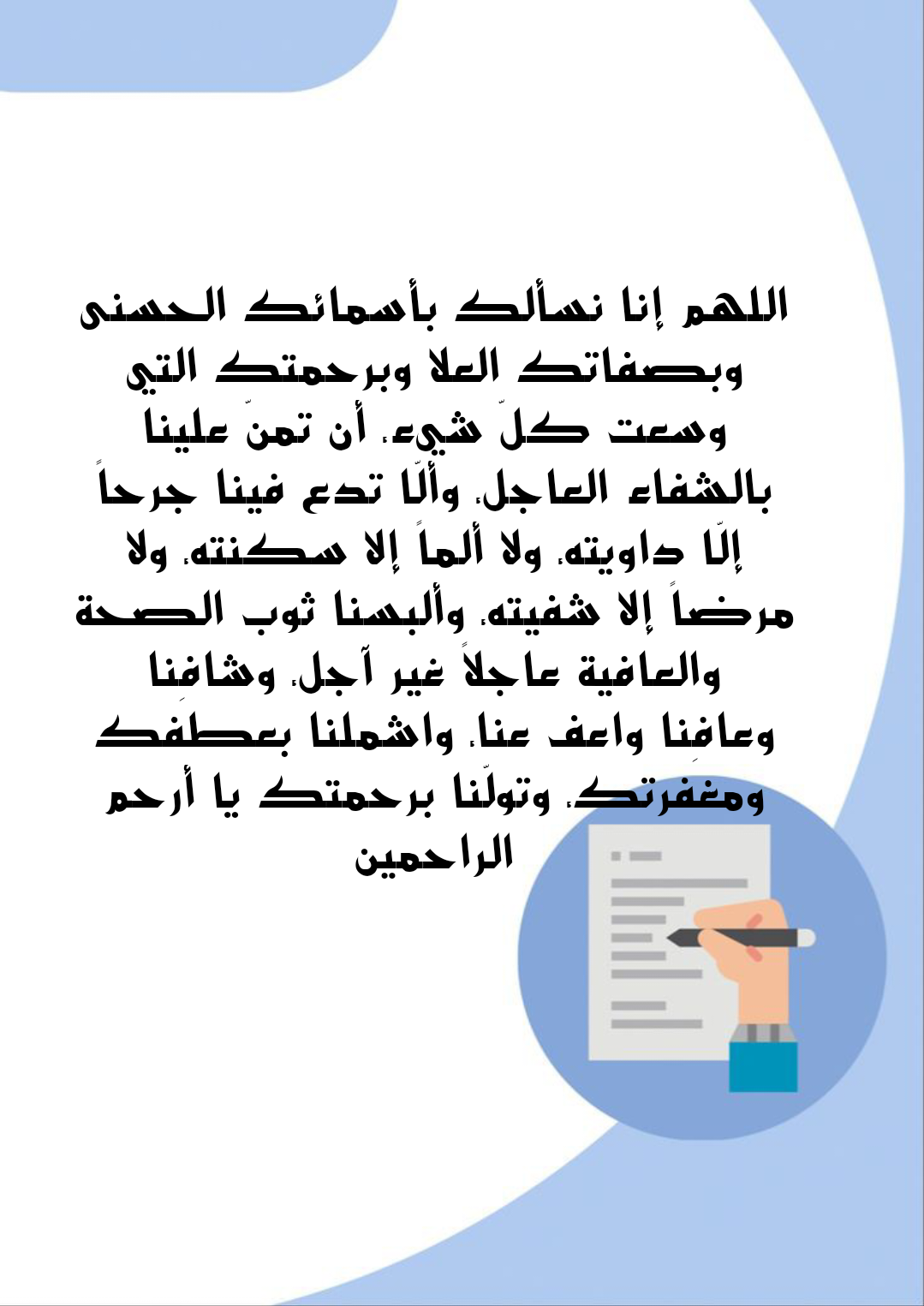 - اللهم إنّا ندعوك ونتضرع إليك بأسمائك الحسنى وصفاتك التي تليق بجلال عظمتك أن تمنّ على مريضنا بالشفاء الكامل اجعل عافيته تتجلى في جسده واجعل اللطف يحفه في ليله ونهاره برحمتك يا أرحم الراحمين وأكرم الأكرمين.