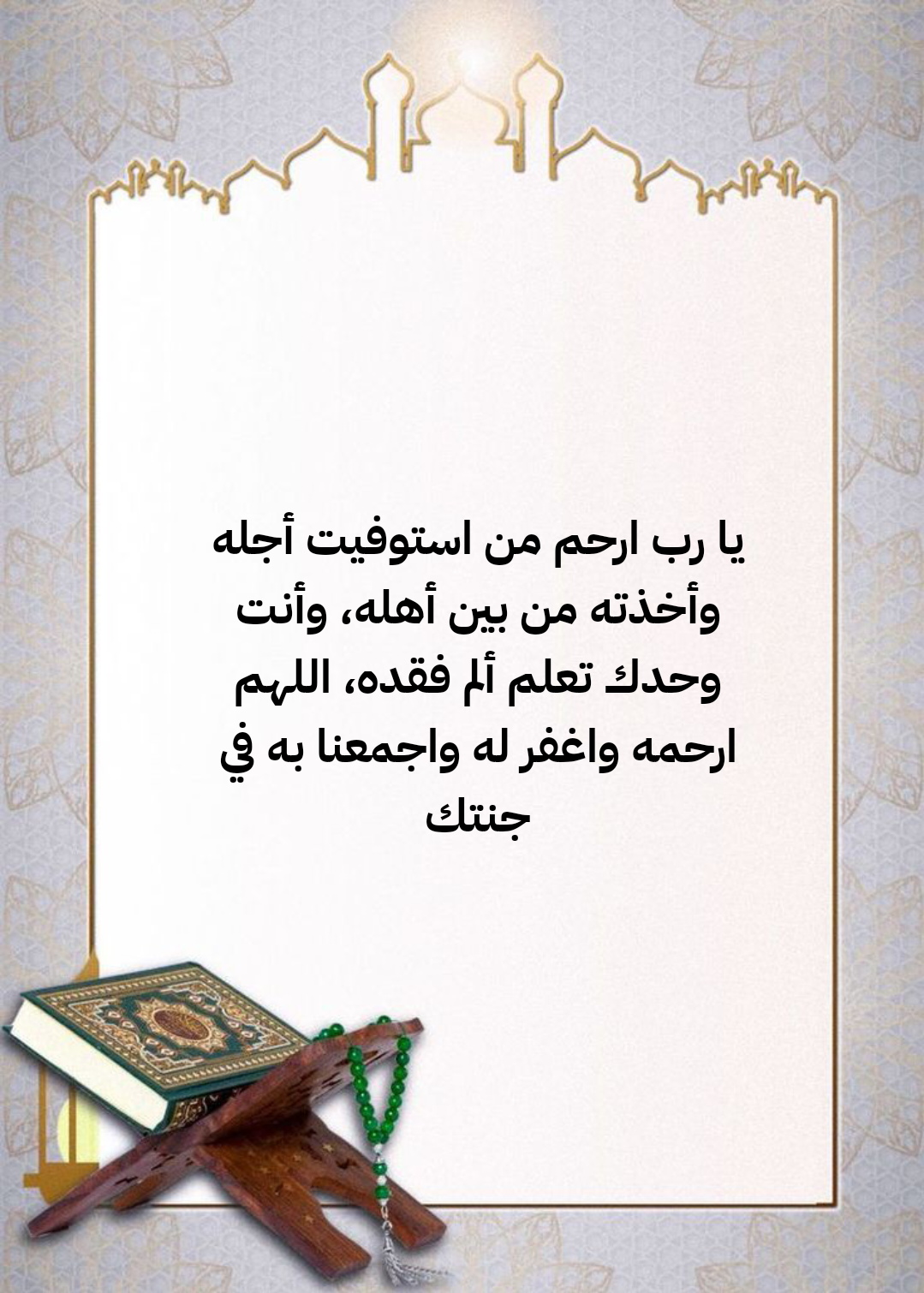 - اللهم عوضْهُ بدارٍ خيرٍ من دارِهِ ووسعْ مكانَهُ بين رحمتكَ وعطفِكَ وأسكنْهُ الدرجاتِ العُلا ومنازلَ مرافقةِ الأنبياءِ والصَّالحين وارزُقه يا الله الفردوسَ الأعلى مع الأبرار واجعل بركتكَ عليه وعلى أهلِهِ وارزقْهم الصبرَ والسلوان.