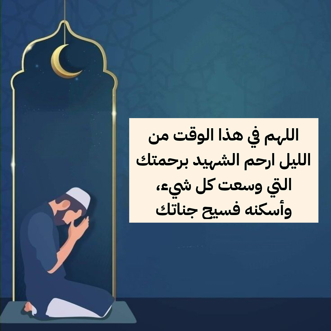 - يا رب نتوجّه إليكَ بخالص الدعاء أن تشمل الشهيد برحمتك التي وسعت كلّ شيء وتمنحه مكانةً ساميةً تليق بجلالك وعظيم لطفك ونسألك يا أرحم الراحمين أن تتجاوز عن ذنوبه وأخطائه وأن تغفر له وتكرمه بفيض من عفوك وكرمك وأن تضاعف له حسناته وتجعل إحسانه في ميزان أعماله خيرًا وبركة وإن كان هناك نقص أو تقصيرٌ من جهته فتتفضل عليه برحمتك الواسعة وتعفو عنه وتجعل له حسابًا يسيرًا وتدخله جنتك بلا عناء ولا مشقة ولا تطيل عليه الوقوف في الحساب ولا تورده موارد العقاب يا كريم..