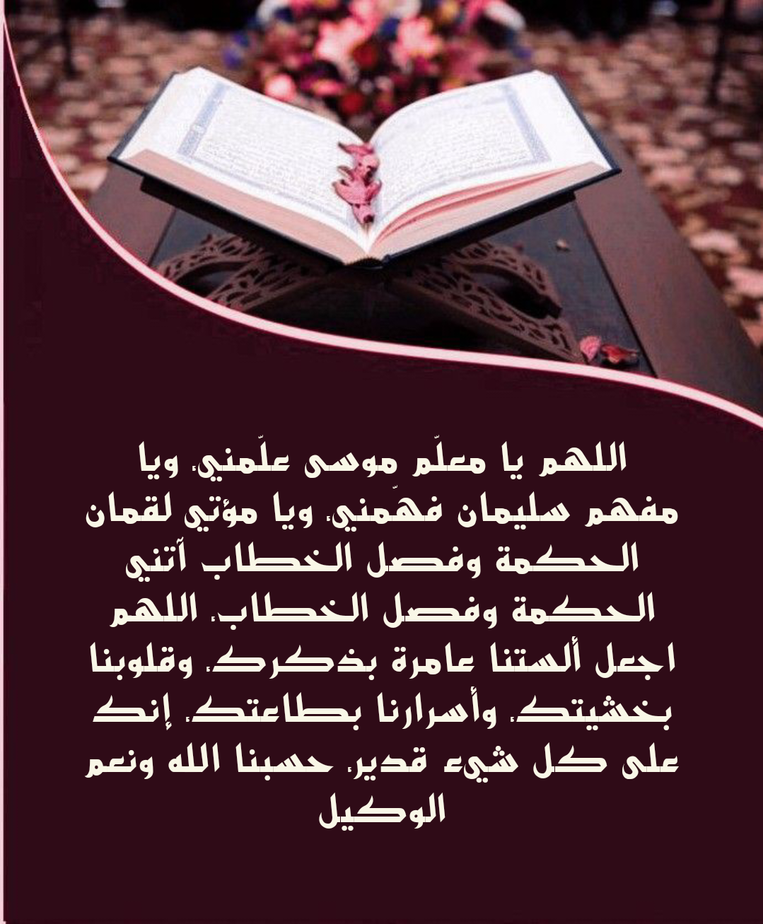- اللهم يَا مُعلم موسى عَلمني وَيا مُفهم سليمان فَهمني وَيا مُؤتي لقمان الحكمة وَفصل الخطاب آتني الحكمة وَفصل الخطاب اللهم اجعل ألسنتنا عامرة بذكرك وَقلوبنا مملوءة بخشيتك وَأسرارنا عامرة بطاعتك فَأنت القادر على كُل شيء.