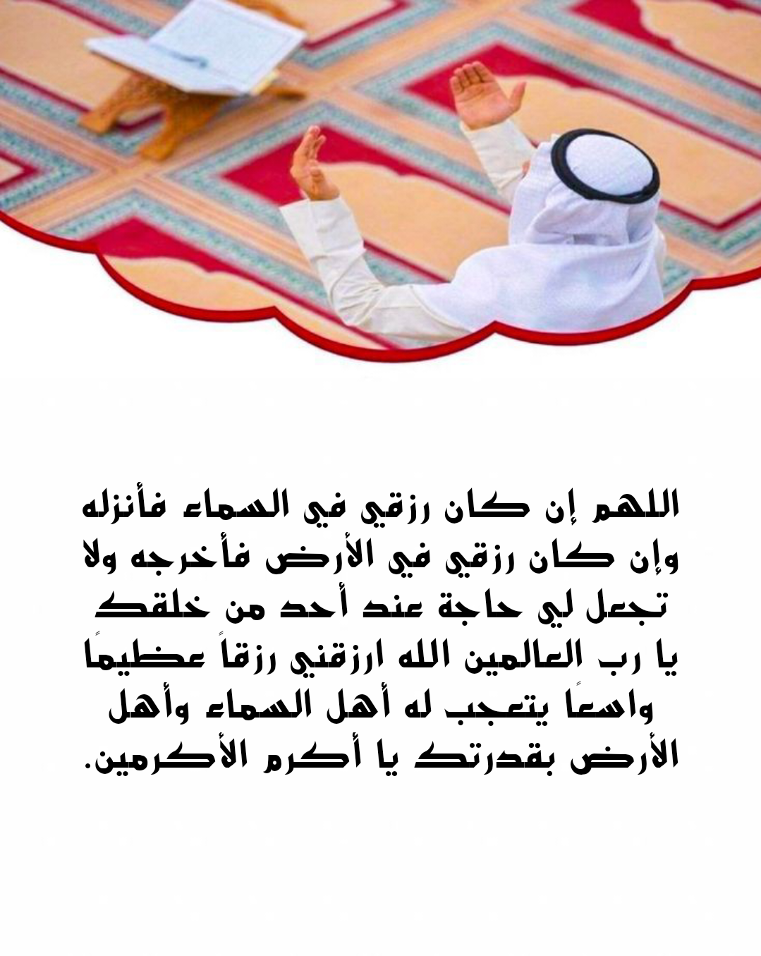 - يا رب أنا أرجع إليك وأعتمد عليك وحدك فلا مانع لما أعطيت ولا معطي لما منعت ورب الخير كله في يدك أعني على دعائك وتلبية طاعتك وسلم أموري لما يرضيك يا أرحم الراحمين أدعوك بأسمائك الطيبة الطاهرة التي نعيش بذكرها لرفع أمري وتفريج كربي وزيادة رزقي وحفظي من كل شر يا رزاق يا كريم.