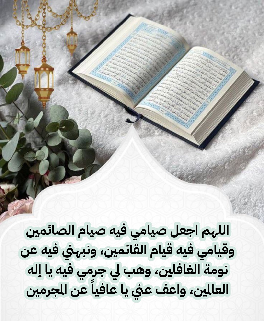 اللّهم افتح لي أبواب رحمتك واغلق عني أبواب المعاصي ووفقني للمداومة على تلاوة كتابك يا من يطمئن بذكره قلوب المؤمنين.