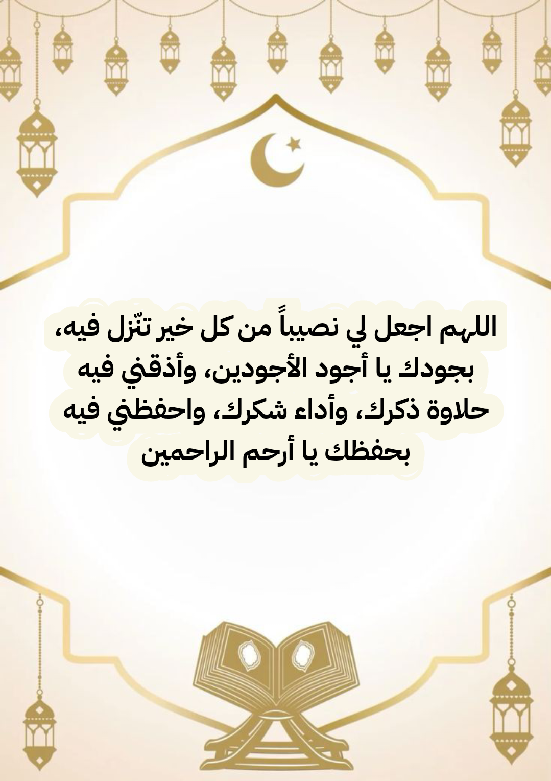 صلِّ على سيدنا محمد وعلى آله الأخيار. اللّهم اجعلني من الذين يدركون بركات ليالي رمضان ونور قلبي بطاعتك وارزقني التوفيق لاتباع سنة نبيك بفضلك يا من تنير القلوب بنور الهداية.