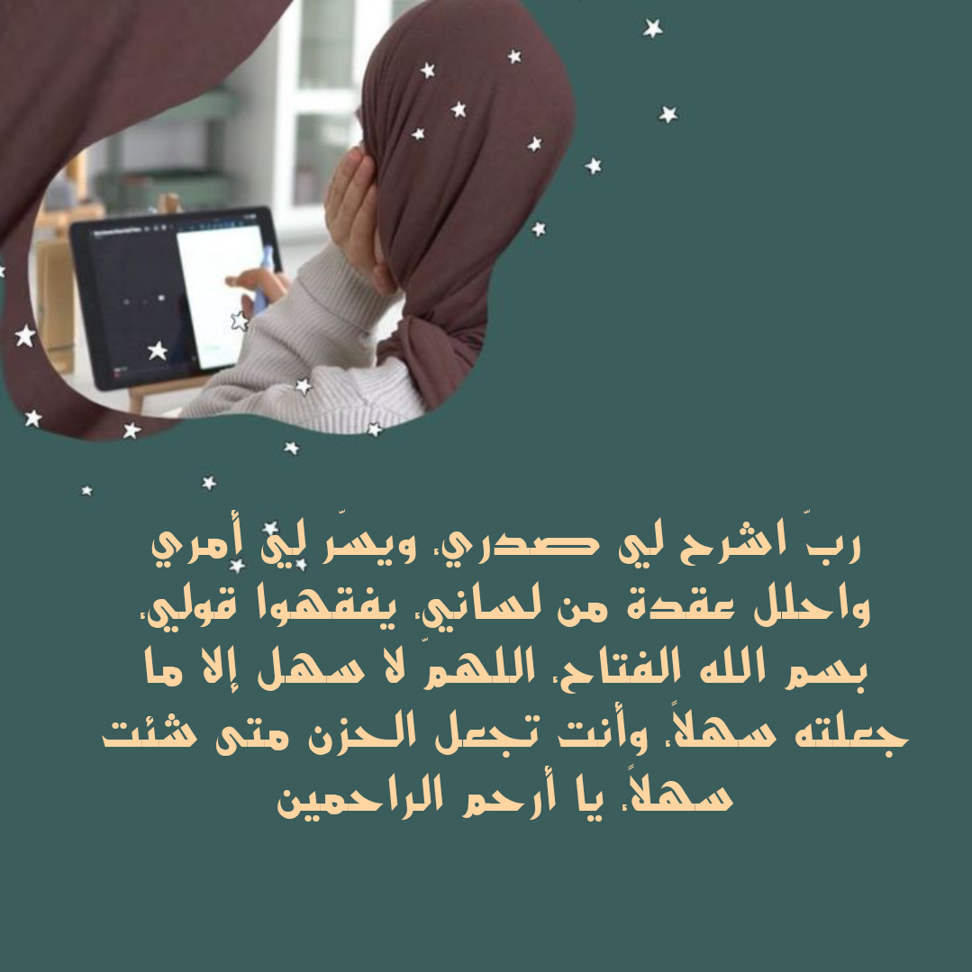 - اللَّهُمَّ يا كَريم يَسِّر لِكُلِّ مَنْ يَسْعى في طَريق طَلبِ العِلم وَبارِكْ لَهُم في جُهدِهِم وَارزُقْهُم النَّجاحَ والتَّوفيقَ وَاحفَظْهُم مِنْ كُلِّ شَتاتِ فِكرٍ أَوْ فِقدانِ وَاحمِهِم مِنْ كُلِّ ضَرَرٍ يُؤذِيهِم.