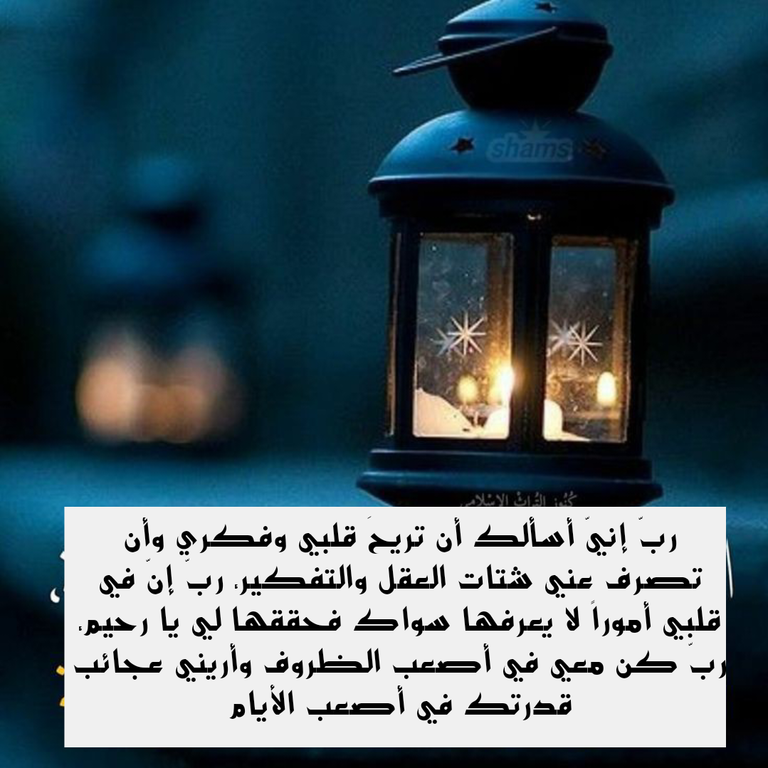 - اللهم يا مؤنس كل وحيد ويا صاحب كل غريب ويا ملجأ كل خائف ويا كاشف كل كربة أسألك أن تمنحني الطمأنينة والرضا وأن تضع في قلبي رجاءك فلا يكون لي همٌّ إلا أنت ولا شغل إلا ذكرك وأسألك يارب أن تيسر لي أمري وتكتب لي من لدنك فرجًا ومخرجًا فإنك على كل شيء قدير.