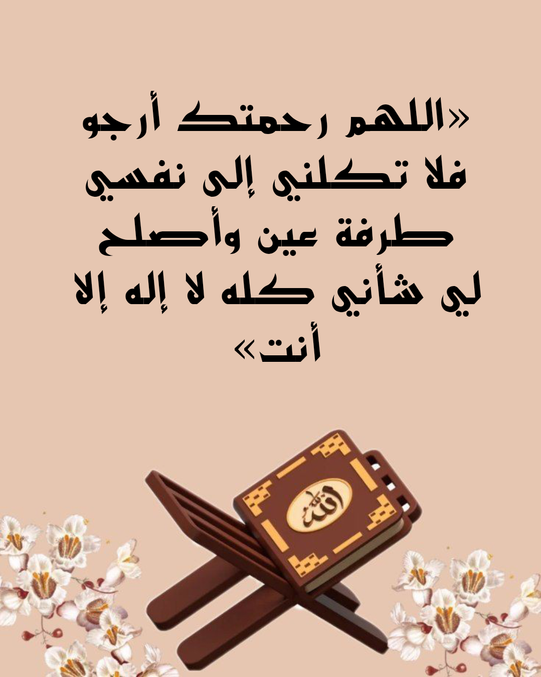 • اللَّهُمَّ طهِّرني من ذنوبي واغسل خطاياي ونقِّ نفسي من عيوبها واملأ قلبي بالإيمان والإخلاص إليك، وأسألُك يا الله أن تُعنيني على ما يُرضيك وأعوذ بك من كل أمرٍ يُغضبك، وأَلحقني بنبيك الكريم في الأخلاق والأفعال، وازرع في قلبي حبَّ من يُحبُّك وبُغض من يُعاديك يا لطيف يا كريم.