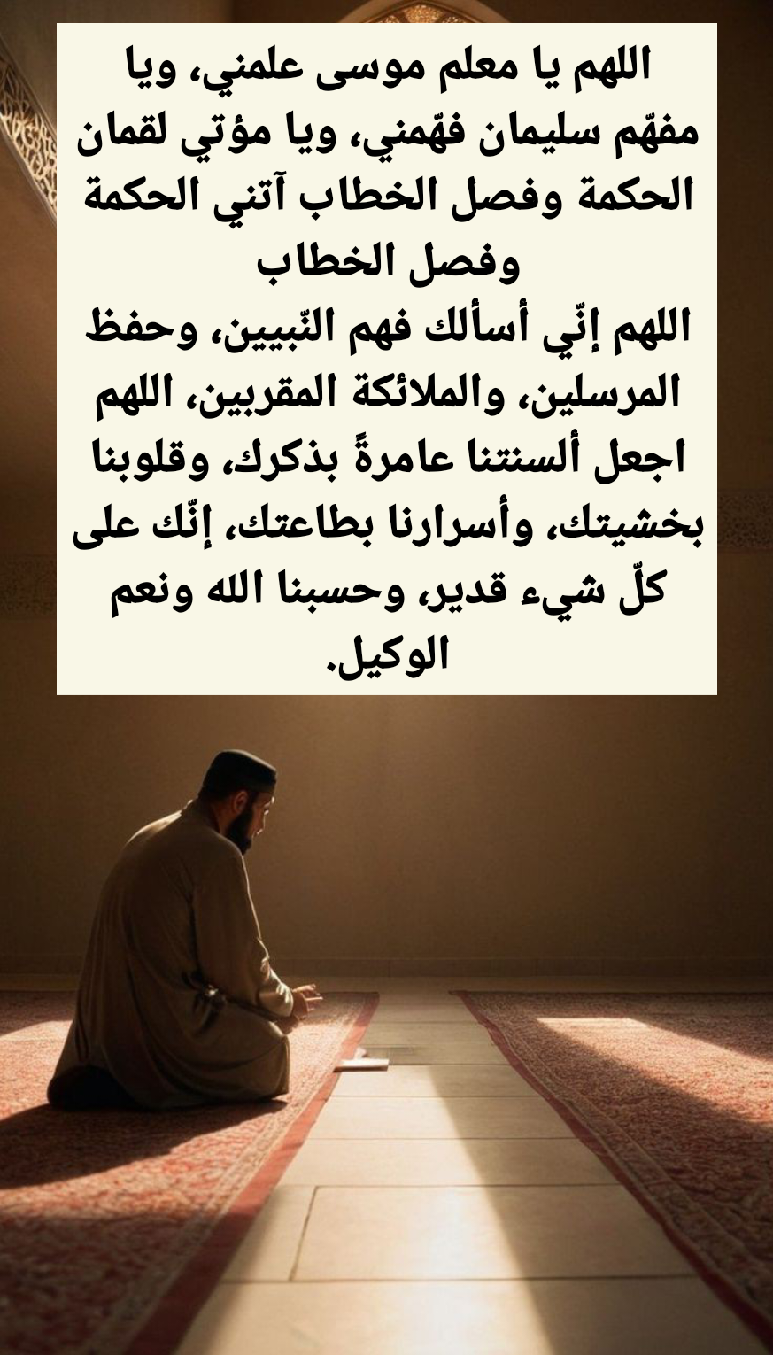 • اللهم لا شيء يسهل إلا بما جعلته سهلاً وأنت إن أردت جعلت الحزن فرجًا وسهلاً اللهم يا من علّمت موسى الحكمة ووهبت سليمان الفهم وأعطيت لقمان الحكمة وفصل الخطاب نسألك أن تهبنا الحكمة والتبيان وفصل الخطاب.