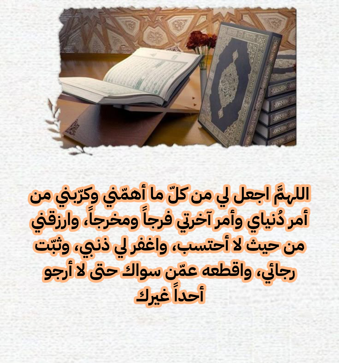 اللهم اجعل لي من كل ضيق مخرجًا ومن كل هم فرجًا وارزقني من حيث لا أحتسب وتجاوز عن ذنوبي وثبّت قلبي علَى طاعتك واقطع رجائي عمن سواك حتى لا أرجو إلا فضلك وحدك.