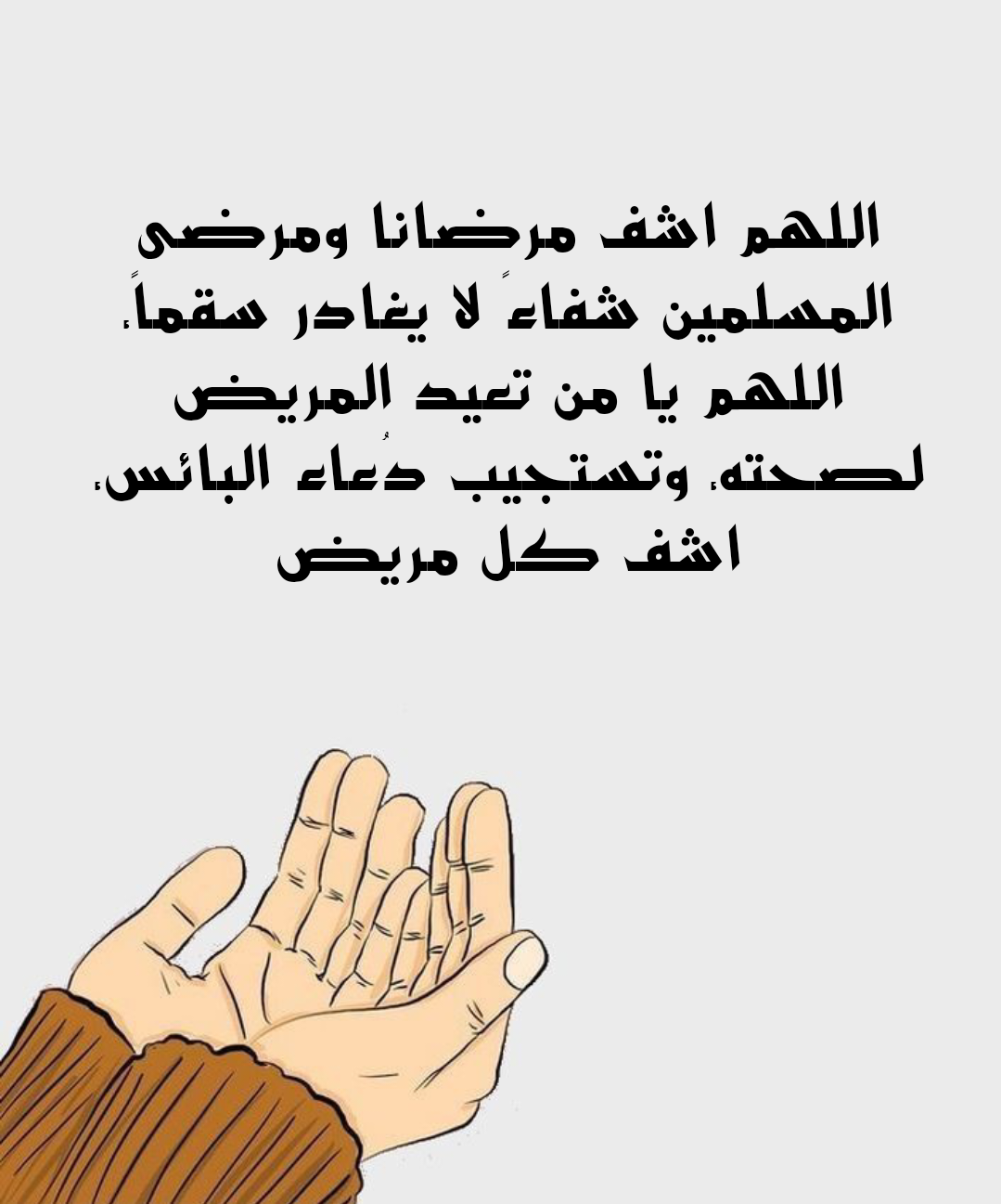 - اللّهُم نسألك باسمك الذي إذا دُعِيت به أجبت وإذا سُئلت به أعطيت أن تشفيَ مرضانا شفاءً لا يُبقي أثرًا ولا يتبعه سقَم اللهم قُمْ على شؤونهم وأزل الوجع عنهم واجعل في أهليهم طمأنينة وفرحًا يا من تجيب دعوة المضطر إذا دعاك وتكشف السوء برحمتك اللهم أكرمنا جميعًا بثوب الصحة والعافية واجعله ملازمًا لنا اللّهم نرجوك متضرعين أن تجعل كل لحظة نمر بها قربًا منك ورحمةً نستنير بها اللهم واشفنا واشف جميع المسلمين يا رب العالمين.