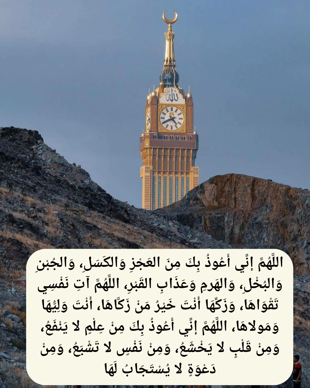 - اللهم إني ألجأ إليك وأعوذ برحمتك أن أسألك عن شيء قد علمته وأنت علام الغيوب وإن لم تغفر لي وترحمني أكن من الخاسرين اللهم اغفر لي ولوالدي ولكل من دخل بيتي مؤمنًا واغفر للمؤمنين والمؤمنات جميعًا ربنا تقبل منا صالح أعمالنا إنك أنت السميع العليم واهدنا إلى الطريق المستقيم واجعلنا لك مسلمين مخلصين وأخرج من ذرياتنا أمة تطيعك وترضيك وأرنا كيف نعبدك كما تحب وتقبل توبتنا إنك أنت التواب الرحيم.