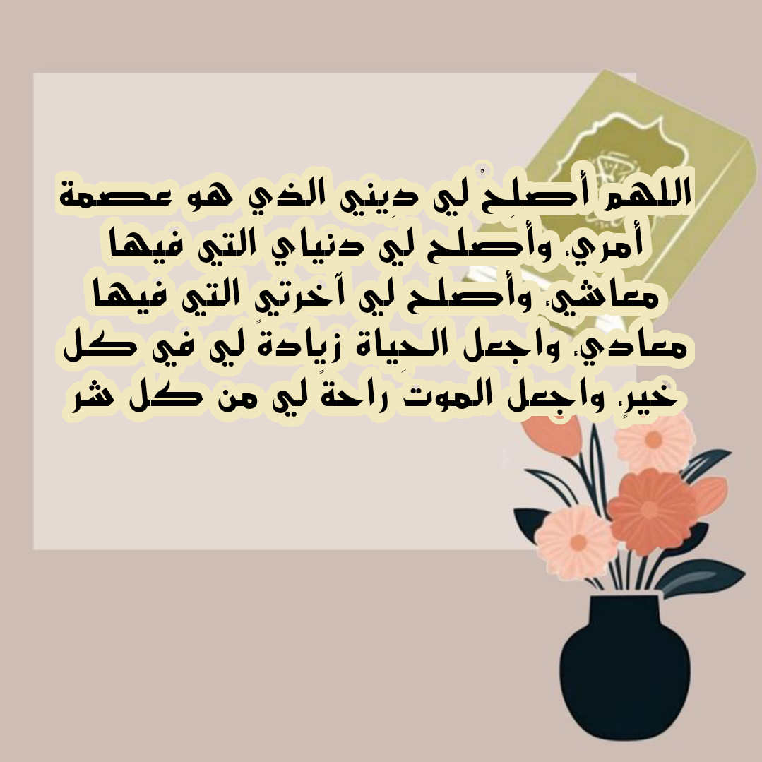 - اللهم إني أسألكَ من رحمتك رحمةً تُهدي بها قلبي وتجمعُ بها أمري وتصلحُ بها شأني وتغنيني عن كلِّ ما يُشغلني تحفظُ بها غائبي وتسترُ بها عيوبي وترفعُ بها قدري وتُزكّي عملي وتُبيّض بها وجهي وتشرحُ بها صدري وتُهديني بها إلى طريق الحق وتعصمني بها من الزلل والخطأ.