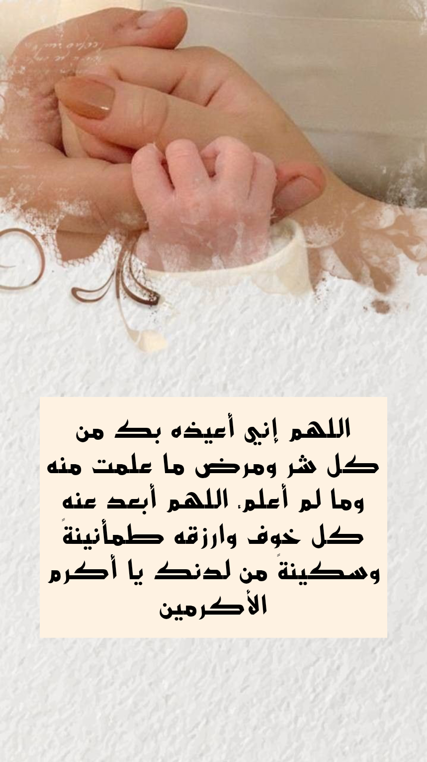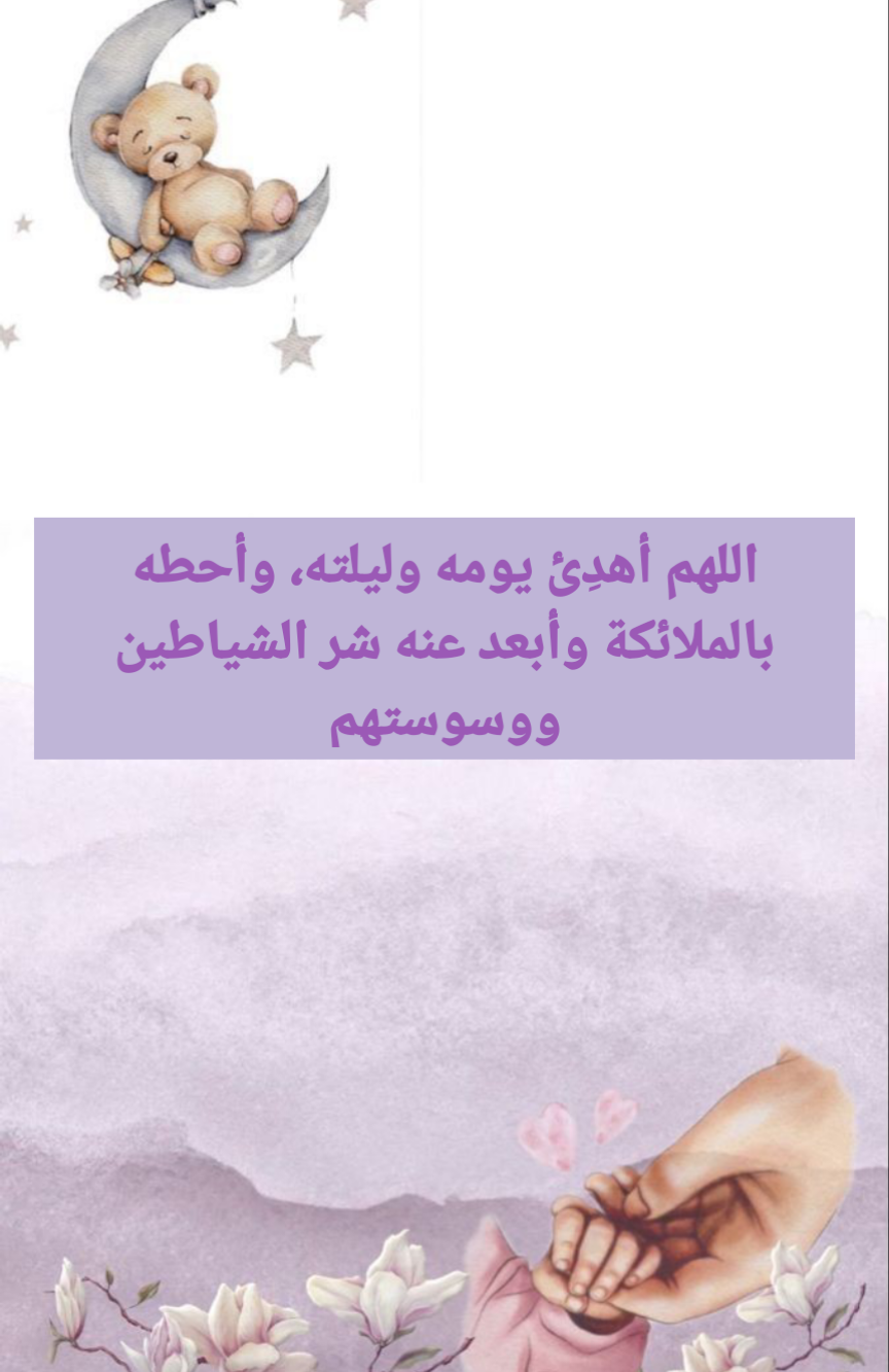 - اللهم يا من تحيط قدرتك بكل شيء أعيذ طفلي بكلماتك التامات التي لا يتجاوزها بر ولا فاجر من شر ما خلقت وأوجدت ومن كل أذى قد يلحق به سواءً كان ظاهرًا أو خفيًا، أسألك أن تحصنه بكلماتك التامات من غضبك وعقابك ومن وساوس الشياطين وهمزاتهم ومن شر عبادك الذين يحملون شرًا أو ضررًا ومن أي عين حاسدة أو أذى مخفي، أستودعك طفلي لتحفظه وتحميه بكلماتك العظيمة التي تعلو ولا يعلى عليها وتصونه من شر ما تحمل السماء ومن شر ما ينزل منها، ومن شر ما ينبت في الأرض وما يدب عليها وما يخرج من أعماقها سواء كان ظاهرًا لنا أو مستترًا، وأعوذك باسمه الكريم وبرحمته التي وسعت كل شيء أن تحميه من شر الطوارق التي تأتي بغتة ليلًا أو نهارًا إلا ما كان خيرًا ورزقًا من لدنك يا واسع الرحمة يا غفور، وأطلب منك يا الله أن تحفظه من كل الفتن والأذية التي قد تحدث في الليل أو النهار وتجعل قلبه مطمئنًا بحفظك ورحمتك وعنايتك التي لا تنقطع أبدًا يا أرحم الراحمين.