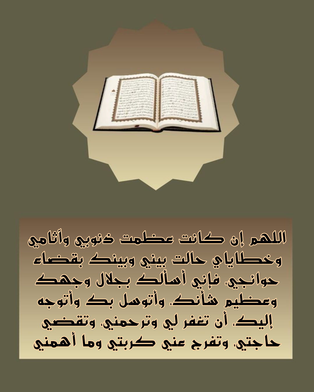 - اللهم قِنِّي شر نفسي واجعل لي من أمري رشدًا وأعني على اتخاذ القرارات الصائبة اللهم اغفر لي زلاتي وذنبي ظاهرها وباطنها وأولها وآخرها يا رب العالمين يا غفور يا رحيم يا من لا يُعبد غيره.