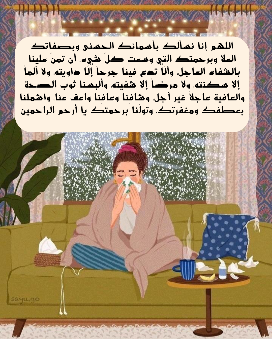 - يا الله نرفع إليك أيدينا وقلوبنا متضرعين بأسمائك الحسنى وصفاتك العُلا وبرحمتك التي وسعت كل شيء أن تمنّ علينا بالشفاء وتزيل عنا كل مرض وتخفف عنا كل ألم وتمنح أجسادنا القوة والصحة اللهم لا تترك فينا وجعًا إلا أزلته ولا مرضًا إلا شفيته ولا جرحًا إلا داويته ألبسنا لباس العافية وأحطنا بعنايتك ورحمتك واشملنا بعطفك يا أكرم الأكرمين.