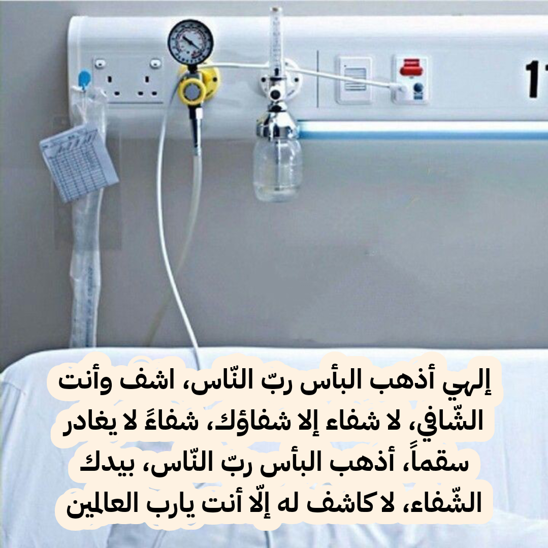 - يا الله يا مالك الملك يا من بيده الشفاء يا من أمره بين الكاف والنون نسألك أن تفرج عنه كربه وتزيل عنه بأسه وتمنّ عليه بالصحة والعافية اللهم اشفِ فأنت الشافي لا شفاء إلا شفاؤك شفاءً لا يغادر سقماً اللهم برحمتك أزل عنه المرض ومده بالقوة ورد إليه عافيته واحفظه بحفظك يا أرحم الراحمين.