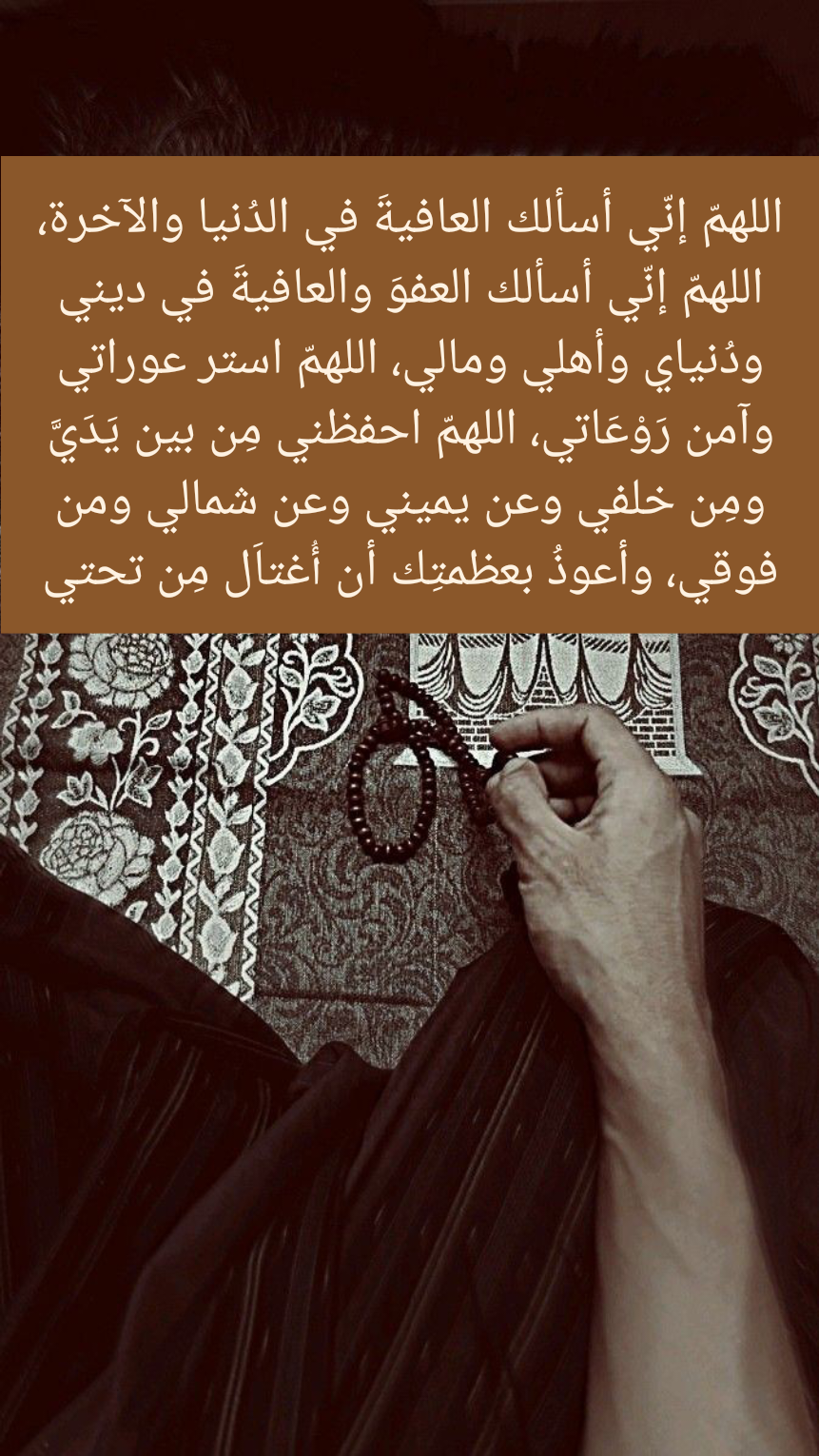 - اللّهُمَّ إنّي توكَّلت عليك وأسألك العافية والسلامة من ظلم وقهر الخلق وأن تفتح أمامي أبواب الخير والتوفيق أينما ذهبت اجعلني متماسكًا أمام البلاء وأكرمني بالصبر والقوة وارحمني رحمة تَسَع كل شؤون حياتي وأسألك يا الله سترًا وافرًا في دنياي وأثناء رحمة قبري وفي جميع لحظات وقوفي أمامك يوم الحساب.