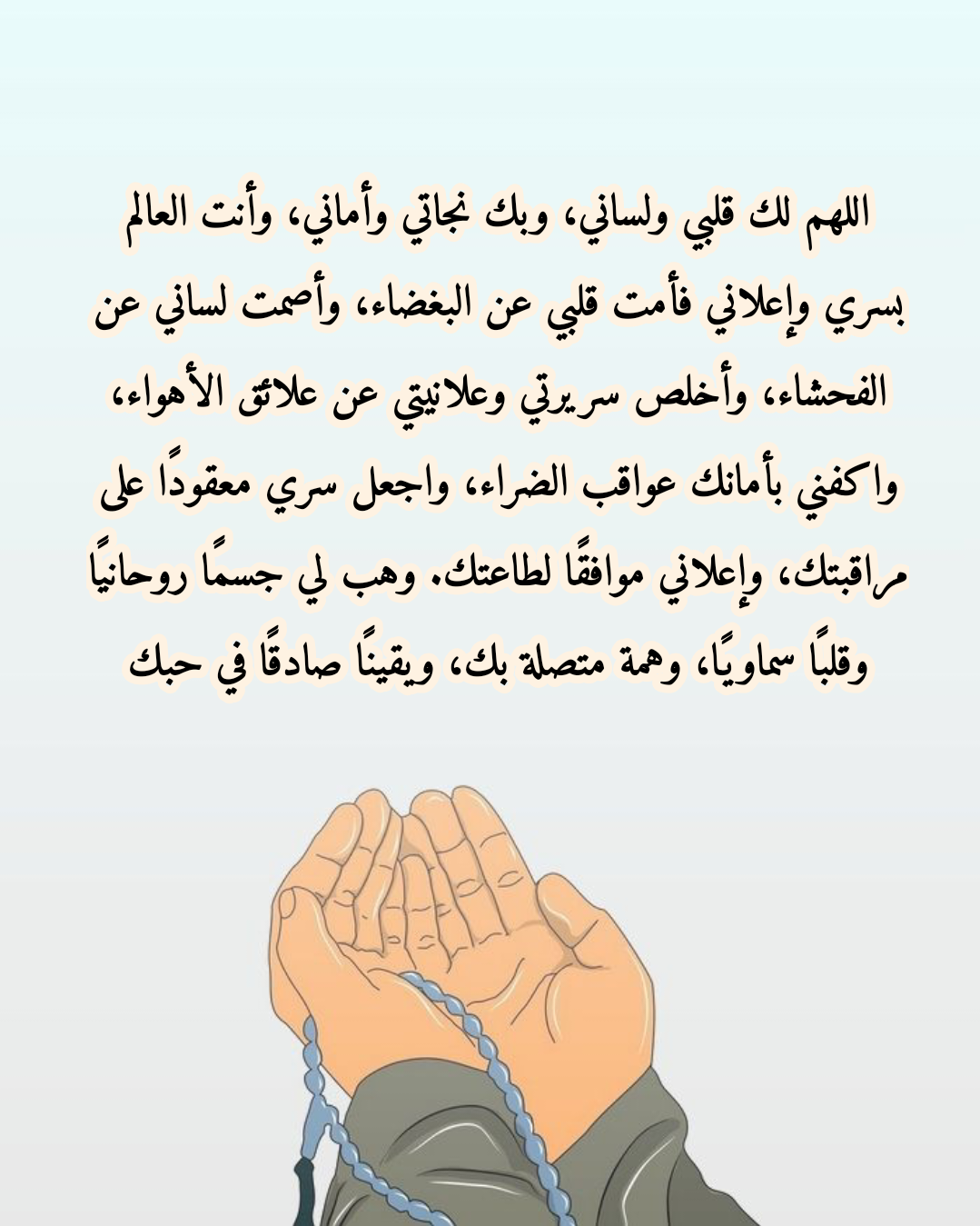 • اللهم بلغ إيماني أعلى مراتبه وأكمل يقيني بأكمل الكمال، اللهم اجعل عملي خالصًا لوجهك الكريم، ونيتي صافية من كل غرض.