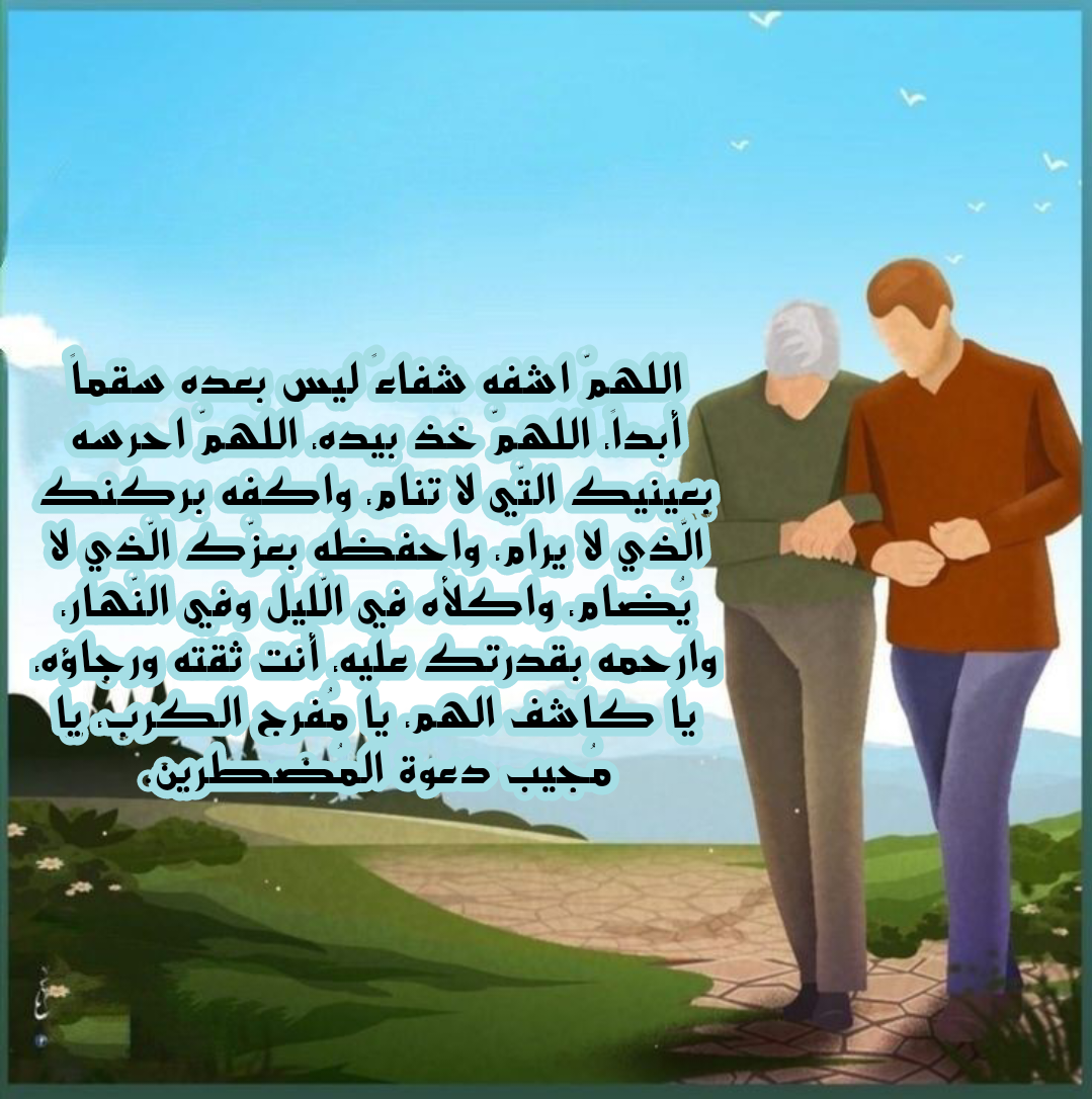 - يا رب العالمين يا من لا يعجزه شيء في السماء ولا في الأرض أسألك برحمتك أن تخفف مرض أبي وأن تشفِ جسده من كل داء، اللهم اجعل صبره على الألم مغفرةً لذنوبه ورفعًا لدرجاته وألبسه لباس العافية والراحة في القريب العاجل يا كريم.