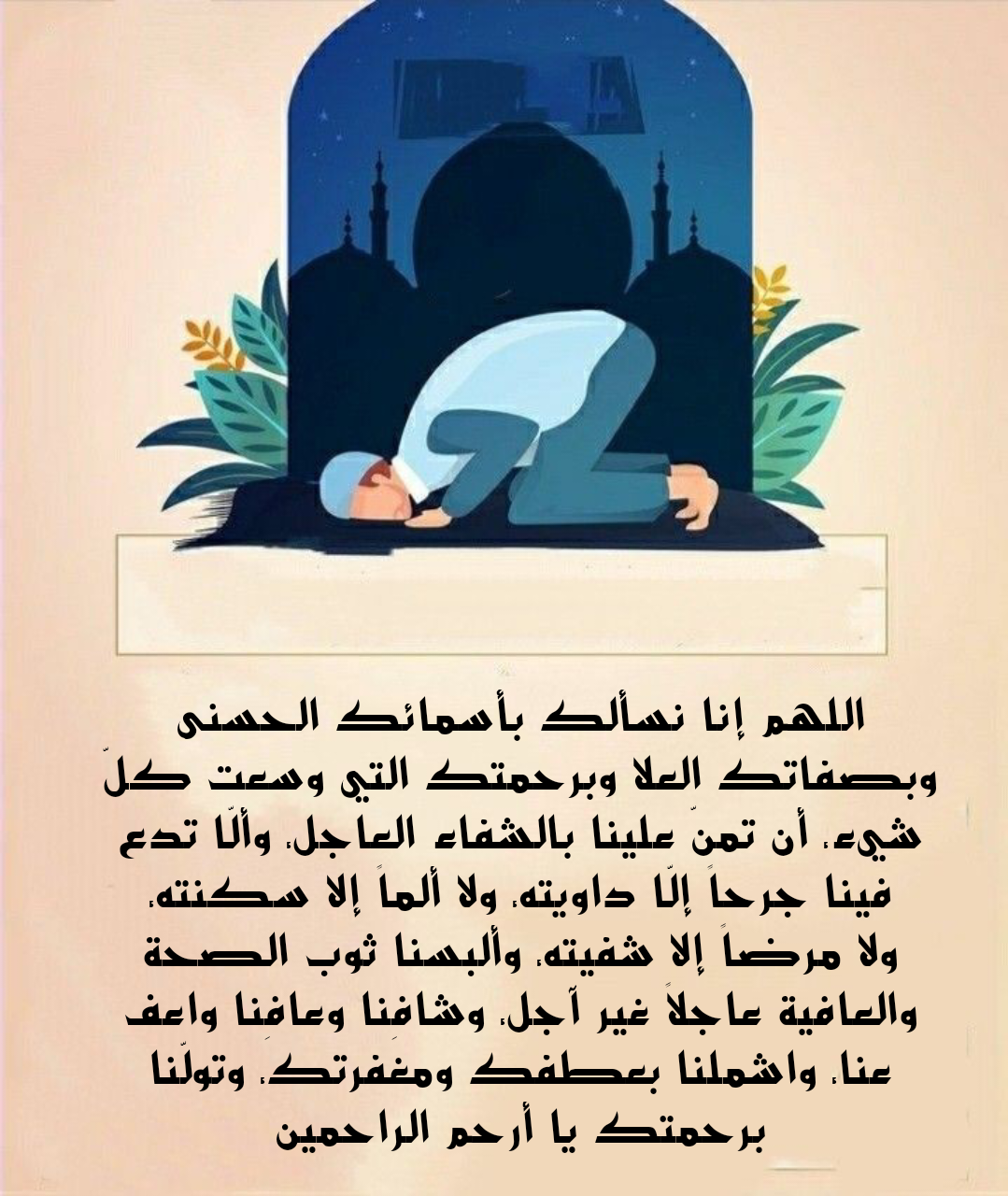 - اللهم أنت الرزاق الكريم أسألك أن ترفع عني وعن أحبتي كل ضرر وأن تهبنا الصحة والعافية والرضا اللهم اجعل الشفاء دائمًا مقرونًا برضاك وفرّج همومنا وأزل كروبنا وامنحنا الخير في أجسادنا وأرواحنا يا رب العالمين.