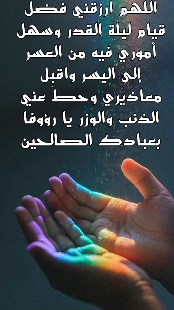 - اللّهم اجعل فضل ليلة القدر نورًا يُضيء حياتنا ويمحو عنّا كل كرب وألم وارزقنا من بركاتك ورحمتك التي لا تنفد واجعل قلوبنا عامرة بالأمل والخير.