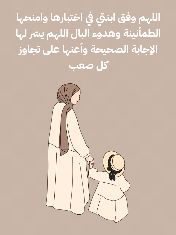 - اللهم وفق ابنتي في اختبارها وامنحها الطمأنينة وهدوء البال، اللهم يسّر لها الإجابة الصحيحة وأعنها على تجاوز كل صعب.