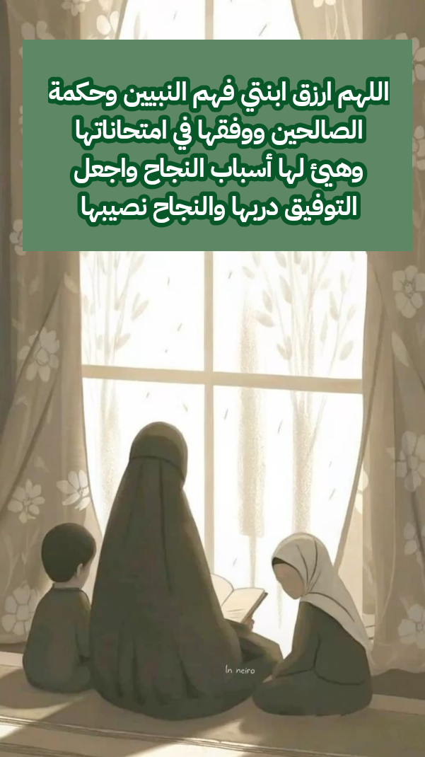 - اللهم ارزق ابنتي فهم النبيين وحكمة الصالحين ووفقها في امتحاناتها وهيئ لها أسباب النجاح واجعل التوفيق دربها والنجاح نصيبها.