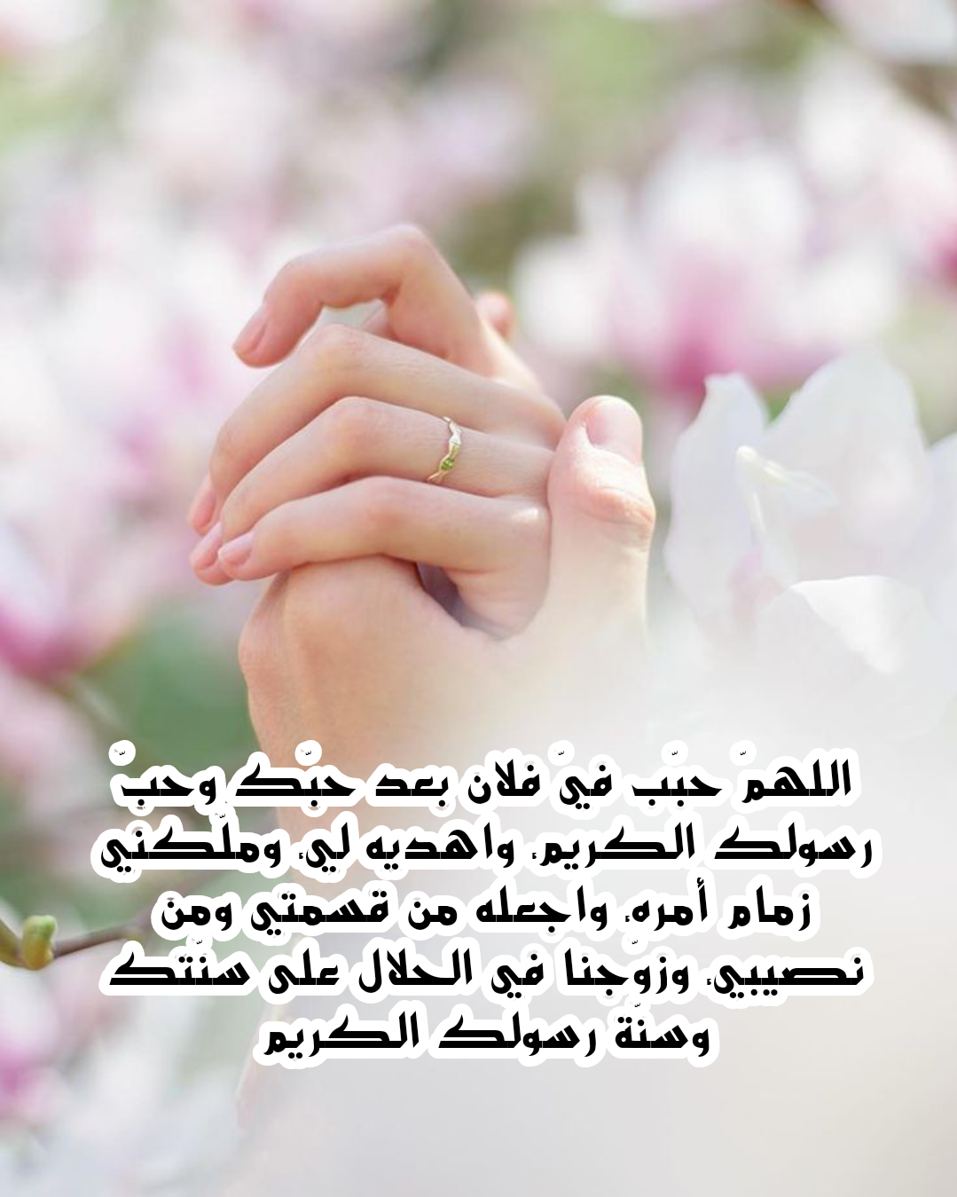 - اللهم ارزقني بزوج صالح أو زوجة صالحة يكون قلبه طاهراً ولسانه عامراً بالذكر وارزقني منه ذرية برة تكون قرة عين لي ولأهلي، وسخر لي الخير والبركة بإذنك يا أكرم الأكرمين.