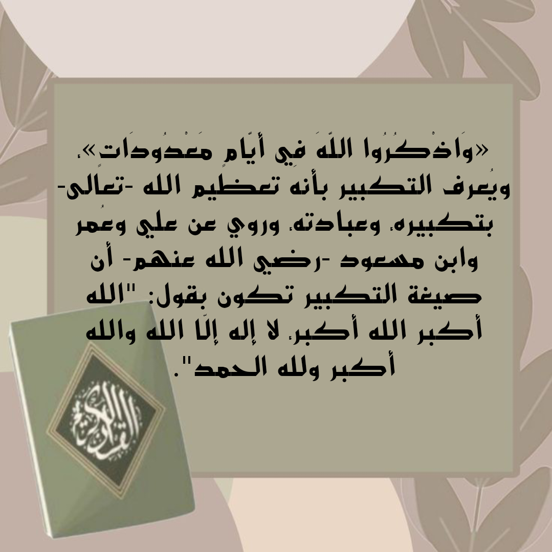 • وَلِتُكْمِلُوا الْعِدَّةَ وَلِتُكَبِّرُوا اللَّـهَ على مَا هَدَاكُمْ وَلَعَلَّكُمْ تَشْكُرُونَ (البقرة: 185).