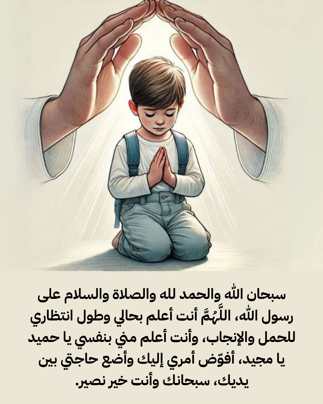 - اللهم إني أسألك لأن لك الحمد، لا إله إلا أنت، الحنّان المنّان، بديع السماوات والأرض، يا ذا الجلال والإكرام، أن ترزقني الذرية الصالحة التي تكون عونًا لي في الدنيا وذخرًا لي في الآخرة.