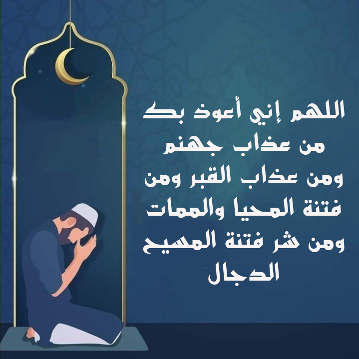 جاء عن أبي هريرة رضي الله عنه أن النبي ﷺ قال إذا تشهّد أحدكم وفي رواية إذا فرغ أحدكم من التشهّد الأخير فليتعوذ بالله من أربع فيقول “اللهم إني أعوذ بك من عذاب جهنم ومن عذاب القبر ومن فتنة المحيا والممات ومن شر فتنة المسيح الدجال”، وعن عائشة رضي الله عنها أنها ذكرت أن النبي ﷺ كان يدعو في صلاته قائلاً “اللهم إني أعوذ بك من عذاب القبر وأعوذ بك من فتنة المسيح الدجال وأعوذ بك من فتنة المحيا وفتنة الممات اللهم إني أعوذ بك من المأثم والمغرم”، فسأله أحد الصحابة عن سبب استكثاره من الاستعاذة من المغرم فقال إن الرجل إذا غرم حدّث فكذب ووعد فأخلف وعن أبي بكر الصديق رضي الله عنه أنه قال للرسول ﷺ يا رسول الله علمني دعاء أدعو به في صلاتي فقال له النبي ﷺ قل “اللهم إني ظلمت نفسي ظلماً كثيراً ولا يغفر الذنوب إلا أنت فاغفر لي مغفرة من عندك وارحمني إنك أنت الغفور الرحيم” .