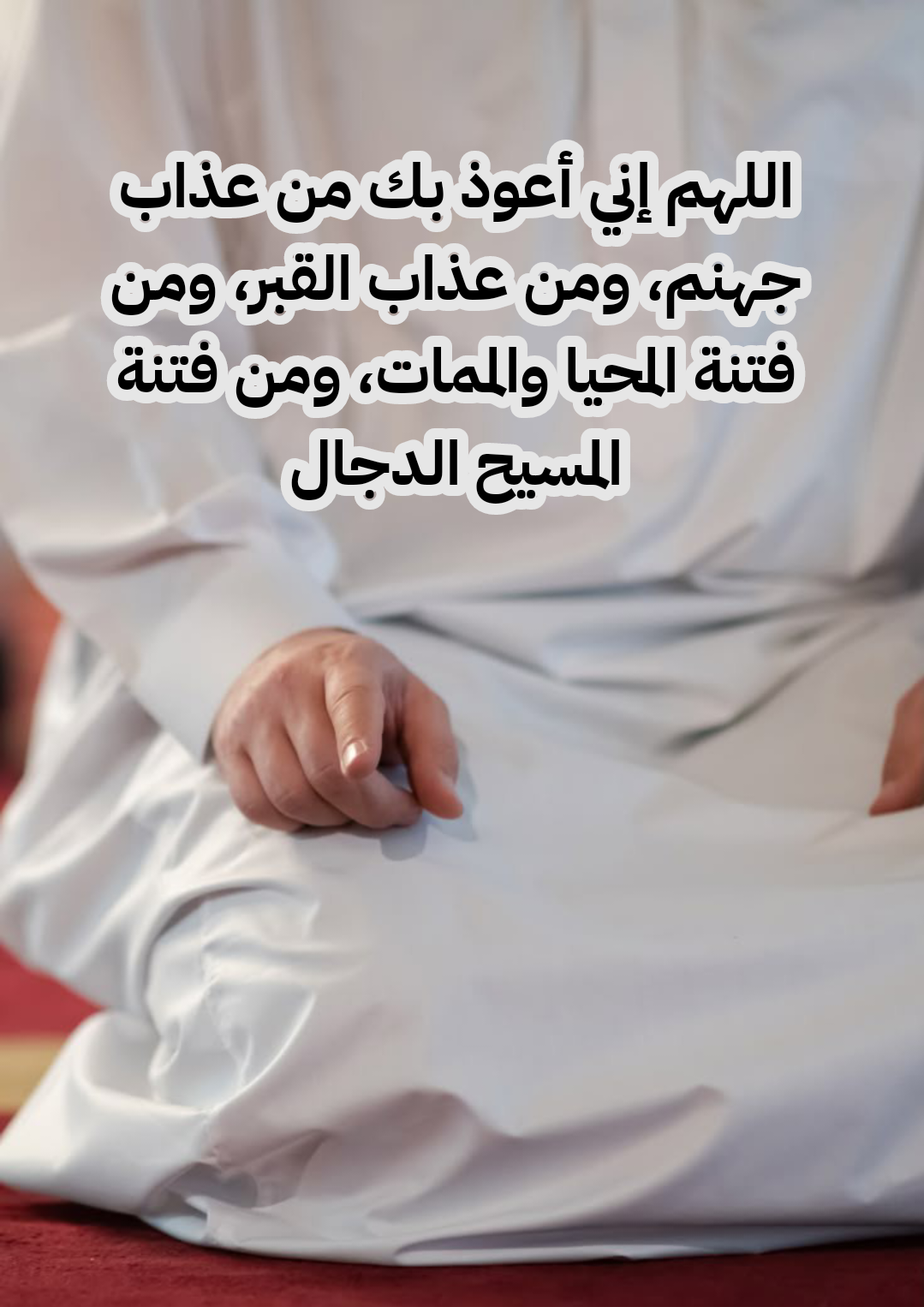 - الدعاء الوارد في التشهد الأخير قبل التسليم: روي عن النبي ﷺ أنه كان يحرص على الدعاء في التشهد الأخير قبل أن يُسلم إذ كان يقول: «اللَّهُمَّ إنِّي أعوذُ بِكَ مِنْ عَذَابِ الْقَبْرِ وَعَذَابِ النَّارِ وَمِنْ فِتْنَةِ الْمَحْيَا وَالْمَمَاتِ وَمِنْ فِتْنَةِ الْمَسِيحِ الدَّجَّالِ» ويُعد هذا الدعاء من الأدعية العظيمة التي أوصى بها النبي ﷺ لما فيه من استعاذة شاملة من الفتن والمصائب التي قد تواجه الإنسان في حياته وبعد مماته.