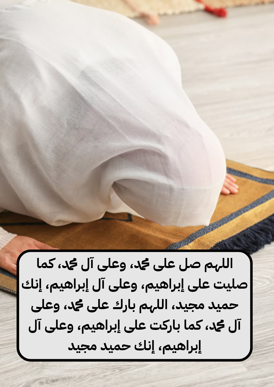 - التَّحِيَّاتُ للهِ وَالصَّلَوَاتُ وَالطَّيِّبَاتُ السَّلَامُ عَلَيْكَ أَيُّهَا النَّبِيُّ وَرَحْمَةُ اللهِ وَبَرَكَاتُهُ السَّلَامُ عَلَيْنَا وَعَلَىٰ عِبَادِ اللهِ الصَّالِحِينَ أَشْهَدُ أَنْ لَا إِلَهَ إِلَّا اللهُ وَأَشْهَدُ أَنَّ مُحَمَّدًا عَبْدُهُ وَرَسُولُهُ اللَّهُمَّ صَلِّ عَلَىٰ مُحَمَّدٍ كَمَا صَلَّيْتَ عَلَىٰ إِبْرَاهِيمَ وَعَلَىٰ آلِ إِبْرَاهِيمَ وَبَارِكْ عَلَىٰ مُحَمَّدٍ كَمَا بَارَكْتَ عَلَىٰ إِبْرَاهِيمَ وَعَلَىٰ آلِ إِبْرَاهِيمَ فِي الْعَالَمِينَ إِنَّكَ حَمِيدٌ مَجِيدٌ.