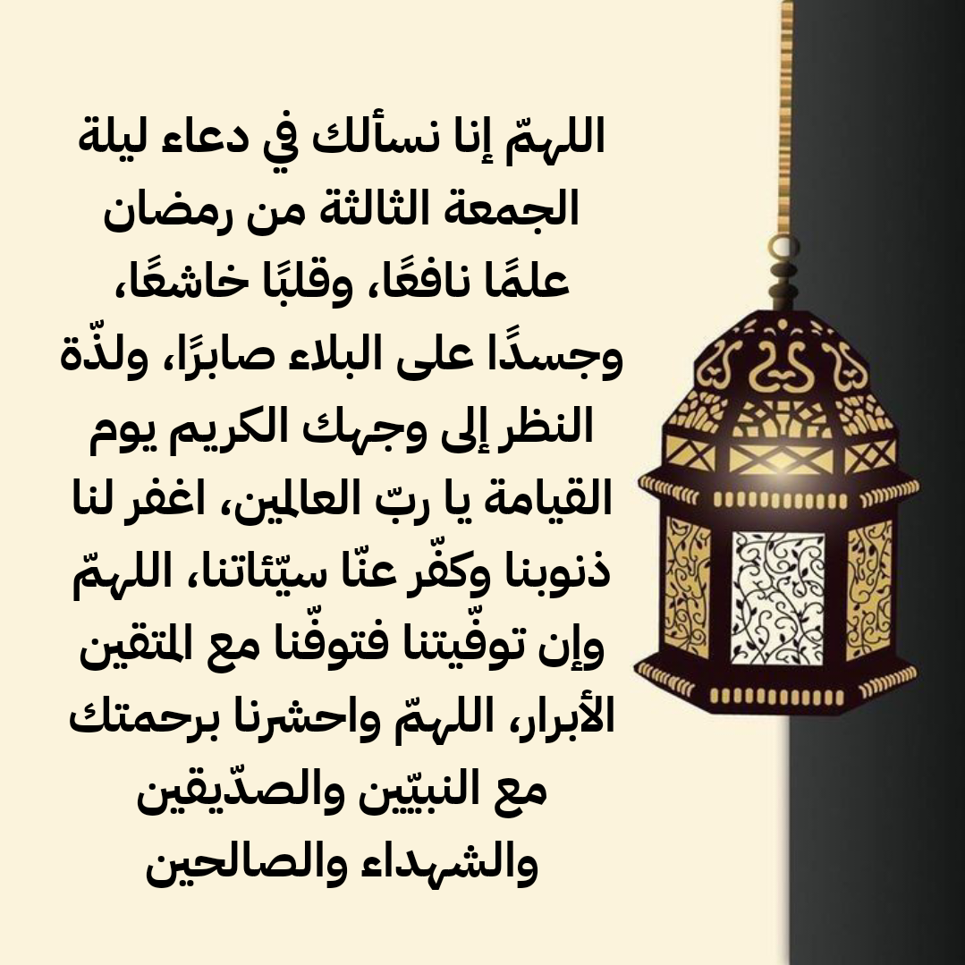 اللّهم في الجمعةِ الثالثةِ من شهر رمضان نسألُك يا كريم أنْ تتقبَّل صيامَنا وتجعلَنا من عبادِك المهتدين لطاعتِك وتمنَّ علينا بإصلاحِ أحوالِنا وتُفرِّج كروبَنا اللّهم لا تدعْ لنا ذنبًا إلَّا غفرتَه ولا غمًّا إلَّا أزلتَه ولا حاجةً من حوائج الدنيا والآخرة إلَّا يسَّرتها بكرمِك ورحمتِك يا أرحمَ الراحمين.