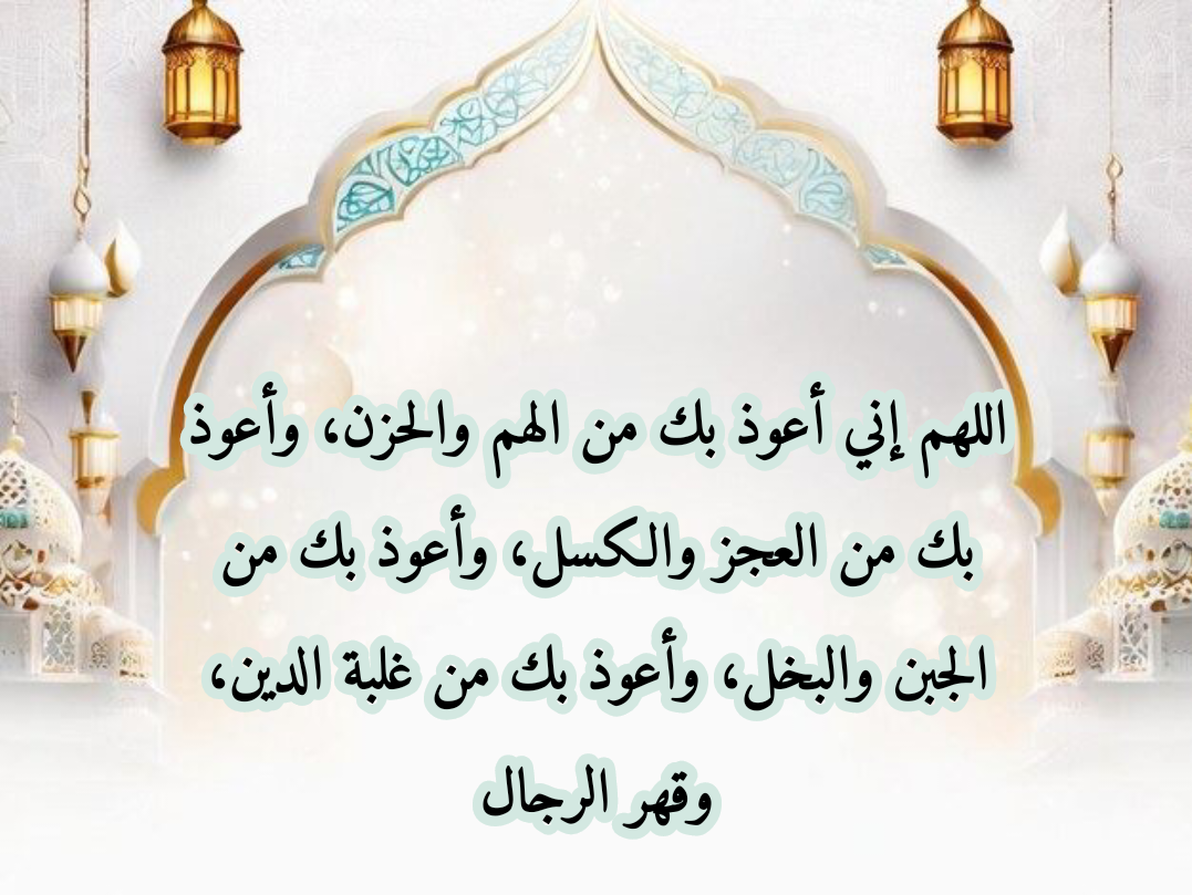 اللهم إني أعوذ بك من حرّ نار جهنّم وممّا يعقُبها من عذاب القبر وألتجئ إليك من الفتن التي قد تُصيبني ظاهرها وباطنها وأحتمي بك من شرّ فتنة المسيح الدجال وأسألك يا الله أن تعيذني من كل هَمّ يُرهقني وحُزن يُثقل قلبي ومن الشعور بالعجز والتعب ومن الكسل والتخاذل ومن البخل والخوف ومن ثقل الديون وقهر الدائنين.