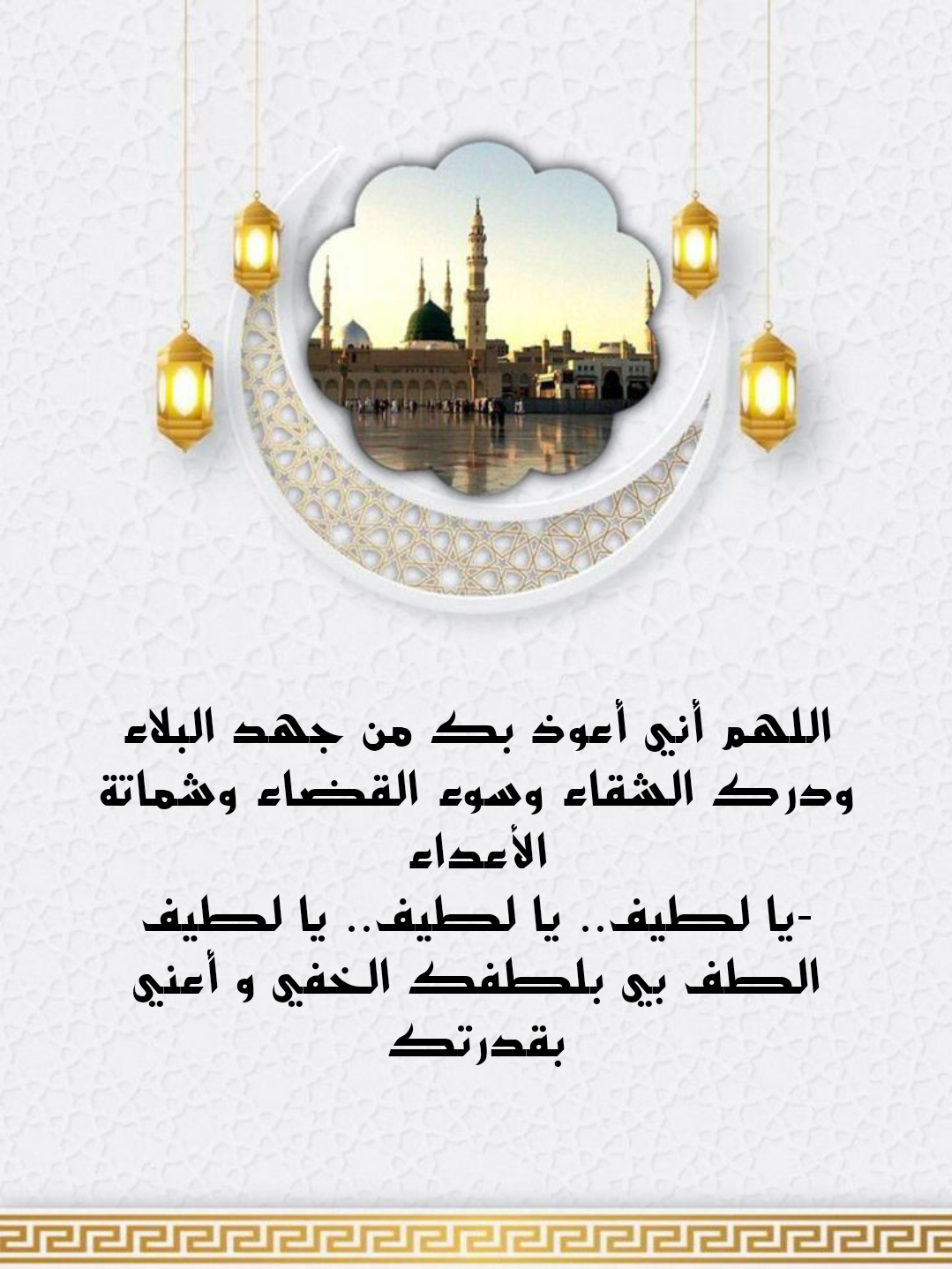 - يا لطيف.. يا لطيف.. يا لطيف الطف بي بلطفك الخفي وأعنّي بقدرتك، اللهم إني أنتظر فرجك وأرتقب لطفك فاللهم الطف بي ولا تكلني إلى نفسي ولا إلى أحد من خلقك، لا إله إلا الله الرحمن الرحيم.