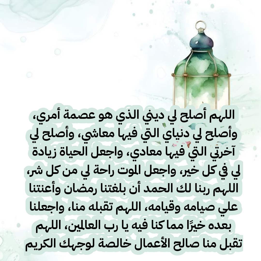 - اللهم اجعلني من عبادك الصائمين القائمين ووفقني لما تحب وترضى واصلح لي شأني كله وتقبل مني دعائي واغفر لي زلاتي برحمتك يا تواب يا غفار.