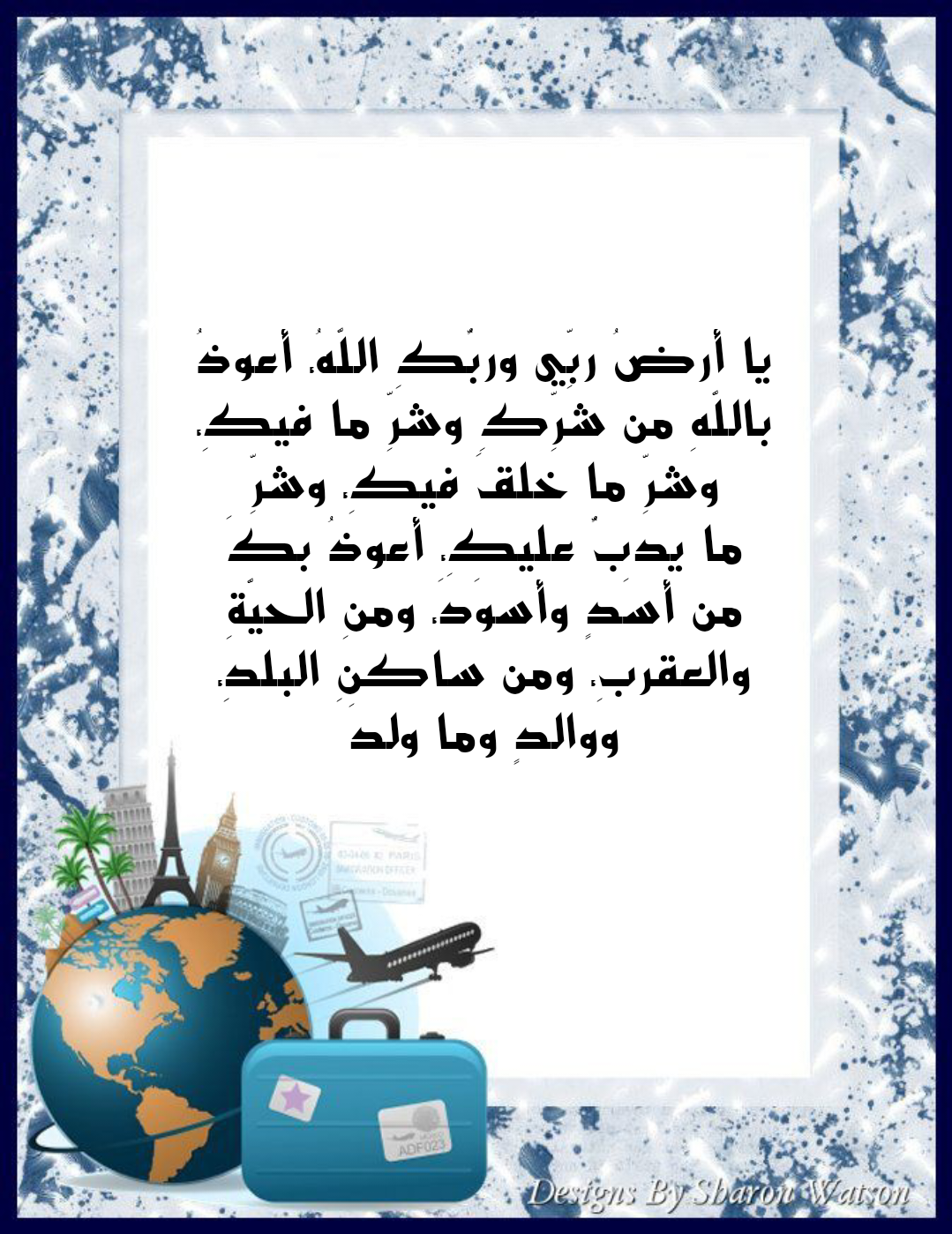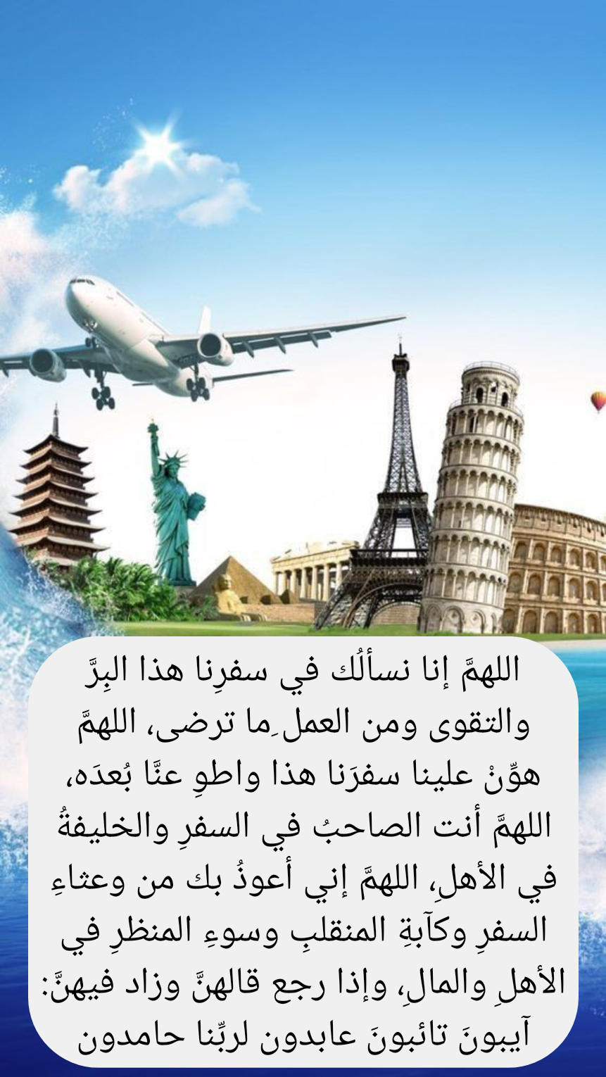 - اللهم في هذا السفر احفظني بعينك التي لا تنام ونجني من كل سوء واصرف عني كل أمر عسير اللهم يسّر لي دربي وهيّئ لي الخير في مقصدي واهدني للبر والتقوى.