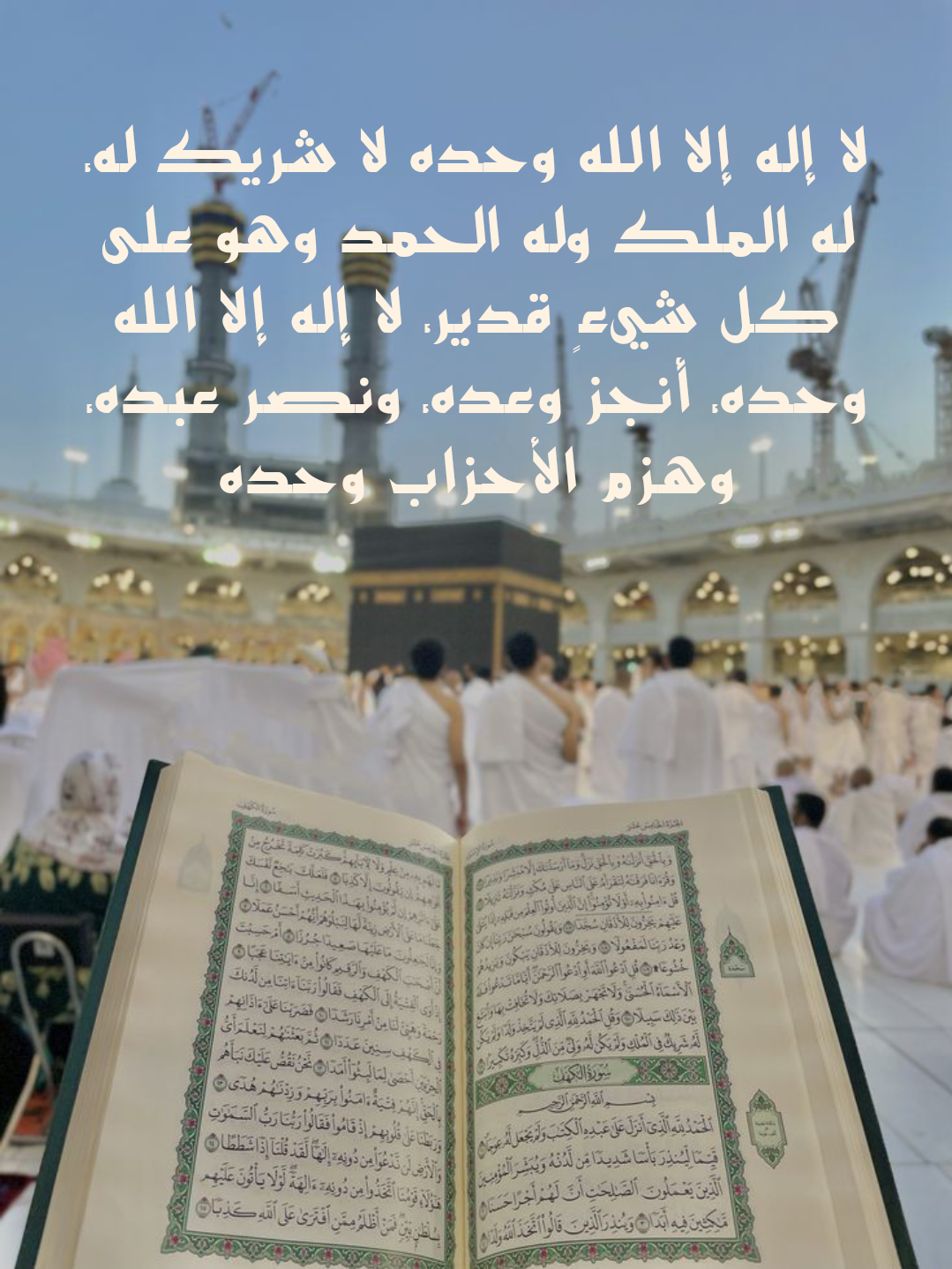 - لاَ إِلَهَ إِلاَّ اللَّهُ وَحْدَهُ لاَ شَرِيكَ لَهُ لَهُ الْمُلْكُ وَلَهُ الْحَمْدُ وَهُوَ عَلَى كُلِّ شَيْءٍ قَدِيرٌ لاَ إِلَهَ إِلاَّ اللَّهُ وَحْدَهُ أَنْجَزَ وَعْدَهُ وَنَصَرَ عَبْدَهُ وَهَزَمَ الْأَحْزَابَ وَحْدَهُ اللهم ارزقنا من بركاتك وأعنّا على كل أمر تُحبّه وترضاه.