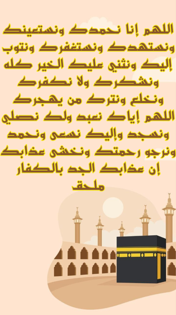 - اللهم إنا نحمدك ونستعينك ونستهدك ونستغفرك ونتوب إليك ونثني عليك الخير كله ونشكرك ولا نكفرك ونخلع ونترك من يهجرك، اللهم إياك نعبد ولك نصلي ونسجد وإليك نسعى ونحمد ونرجو رحمتك ونخشى عذابك إن عذابك الجد بالكفار ملحق، اللهم لك الحمد كله ولك الشكر كله وإليك يرجع الأمر كله علانيته وسره فأنت أهل لأن تحمد وأهل لأن تعبد وأنت على كل شيء قدير، اللهم لك الحمد حتى ترضى ولك الحمد إذا رضيت ولك الحمد بعد الرضى ولك الحمد كالذي قالوا خيرًا مما نقول ولك الحمد على كل حال، اللهم لك الحمد أنت نور السماوات والأرض وأنت بكل شيء عليم.